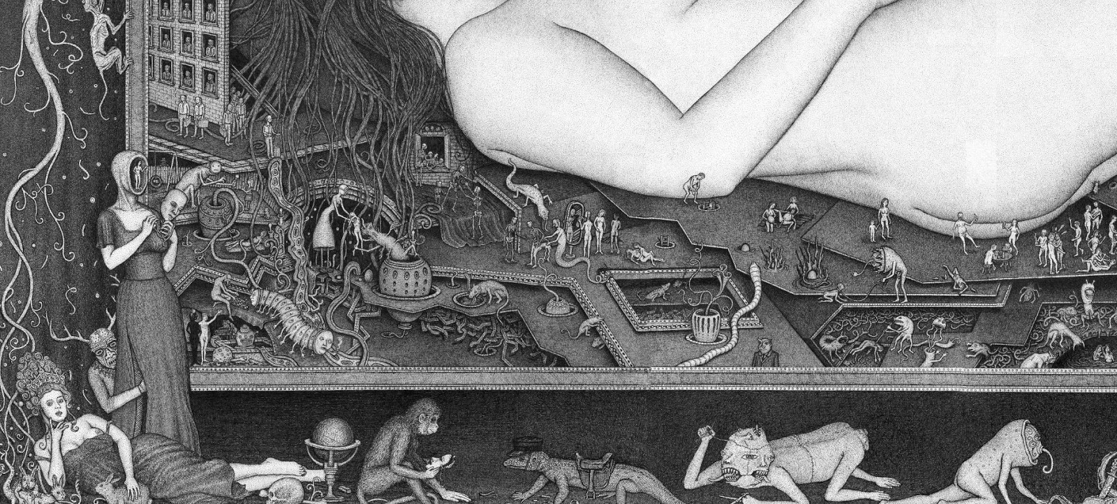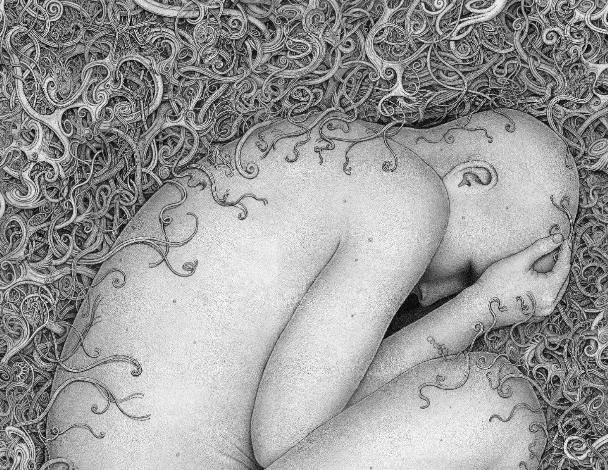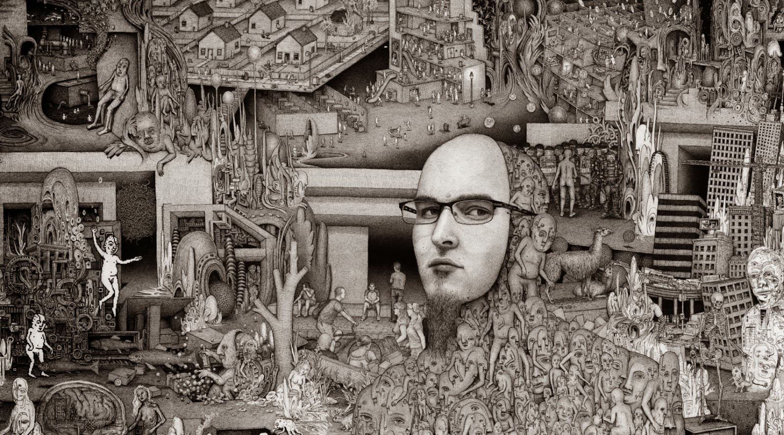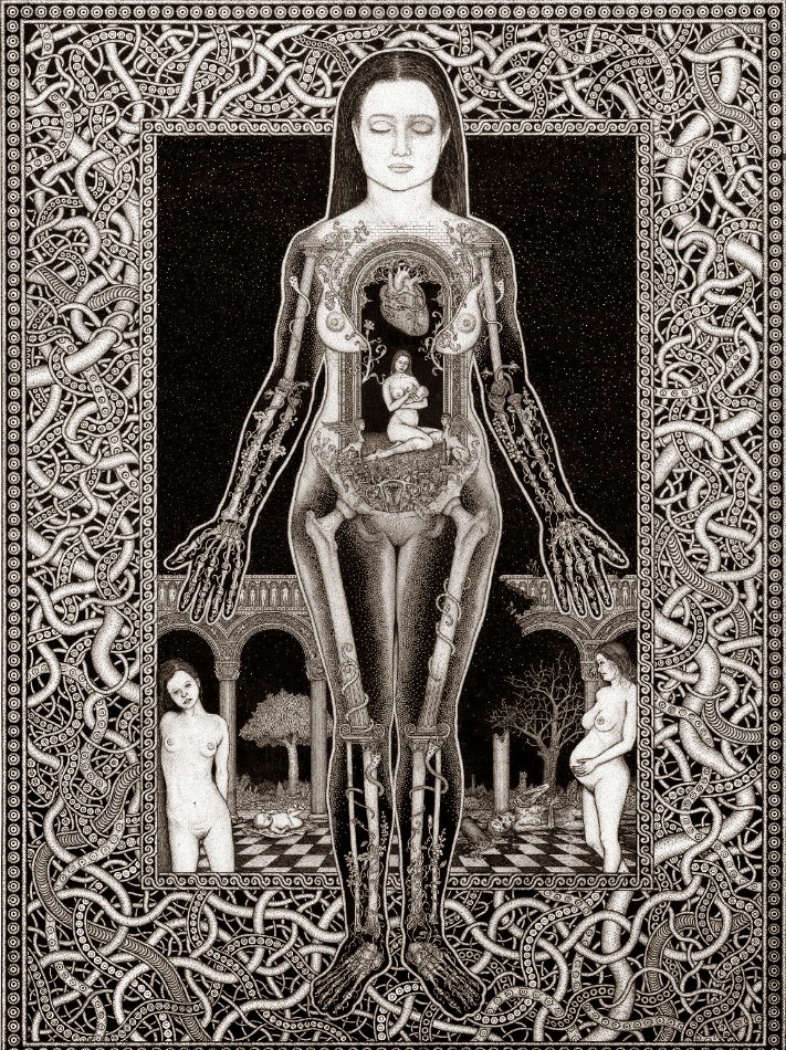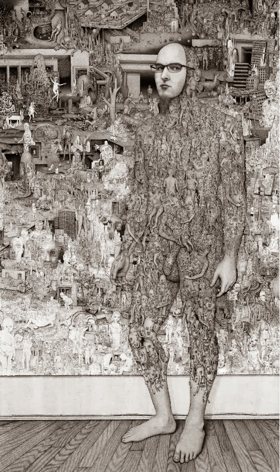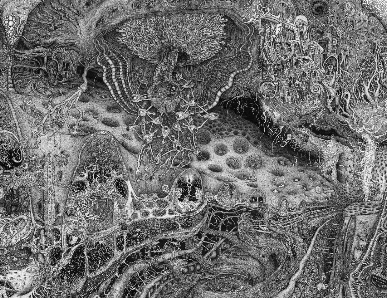 Through art, I create a space for myself to slow down and reflect on this unlikely experience I am embedded within. I am fascinated by with the juxtapositions of the mundane patterns of everyday life and the extraordinary peculiarity of life itself. While going through the repetition of everyday tasks it is easy to forget just how strange and complex life is. I am in constant amazement that life works and this whole unlikely project of existence continues to unfold so flawlessly. In a world that’s constantly moving faster and faster my meticulous ink drawings allow me the space to slow down and explore my circumstances. I was raised in a conservative Mormon family. The meaning of life came in a neat packaged box but fell apart with the slightest bit of scrutiny. Long ago as a child, I abandoned any existing cultural mythology as an explanation for life and have been exploring this mystery, and creating my own mythology through art, ever since. Without any prepackaged creation stories, I have the freedom to just reflect on the mystery, beauty and horror of it all without any prejudice. The more I learn, the stranger everything becomes. But this grandeur of possible thoughts and experiences has to still be tempered with the same mundane tasks and struggles of the daily slog through life that has always been with mankind. The slow process of dense ink drawings allows time to dig out a more subtle understanding of my circumstance and embed that in my work. In my recent work I am exploring the spaces I, and we as a culture, create and inhabit. I am interested in how our constructed environment limits us as well as offering us possibilities. Within this constructed environment, I am further interested in the peculiarities of the individual in relation to the larger culture.