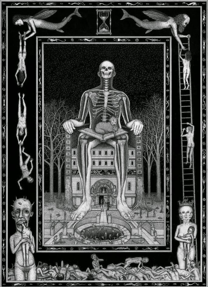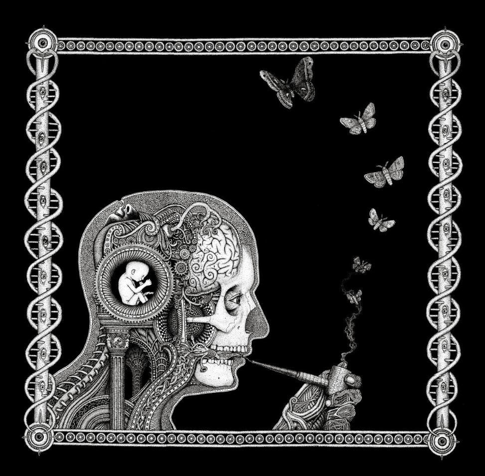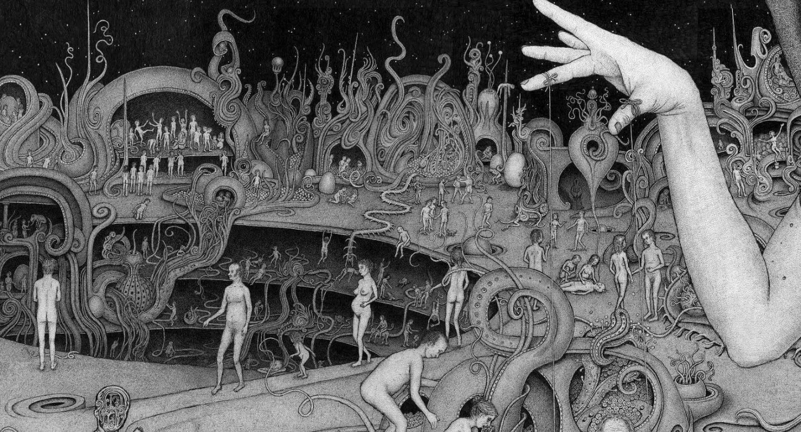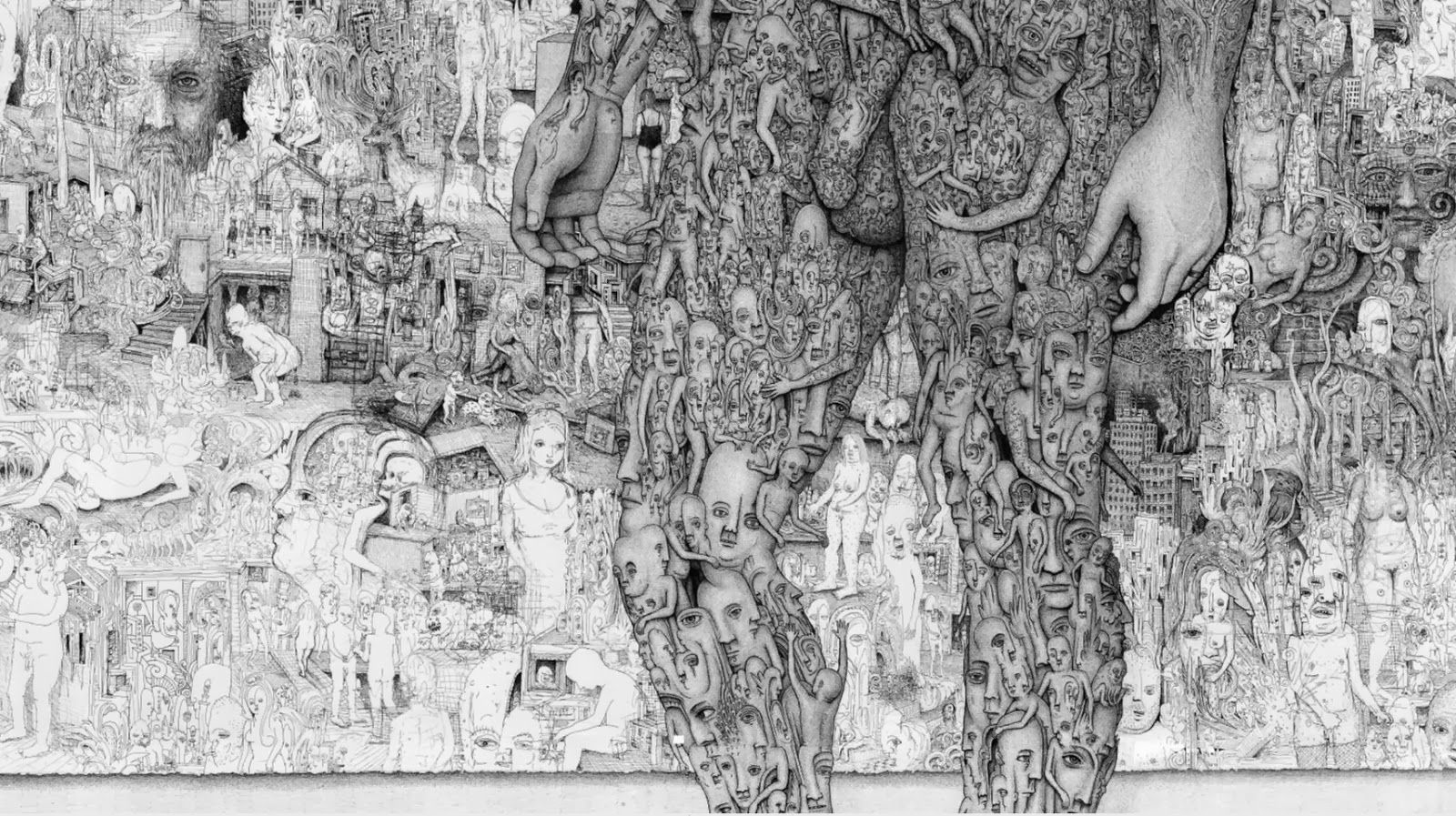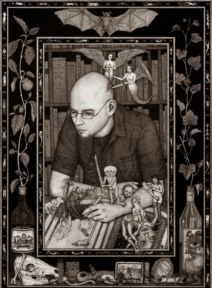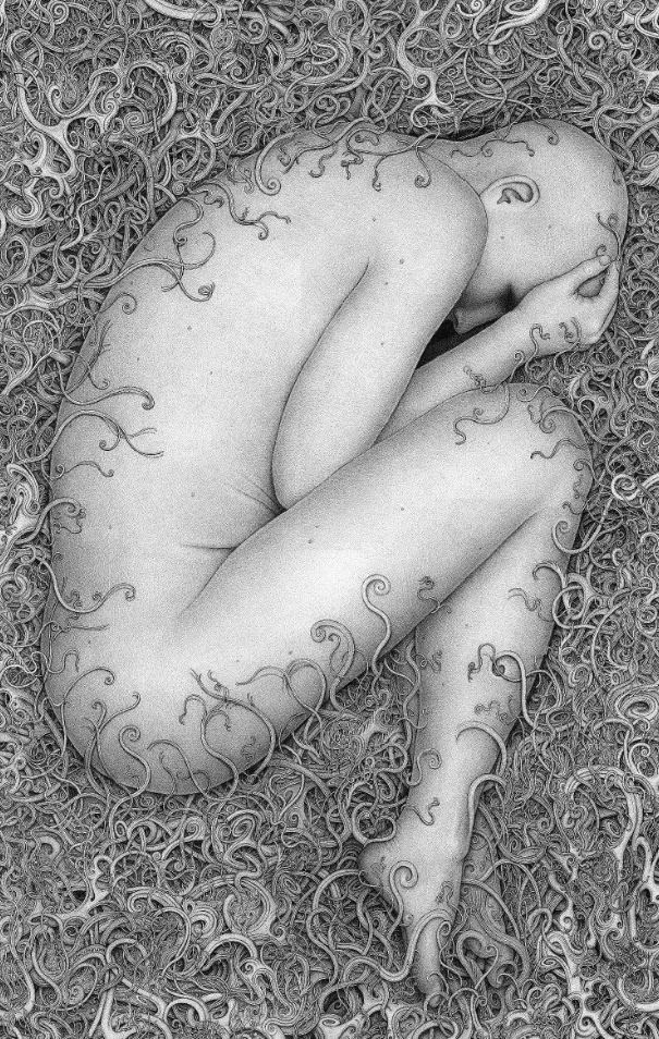 Through art, I create a space for myself to slow down and reflect on this unlikely experience I am embedded within. I am fascinated by with the juxtapositions of the mundane patterns of everyday life and the extraordinary peculiarity of life itself. While going through the repetition of everyday tasks it is easy to forget just how strange and complex life is. I am in constant amazement that life works and this whole unlikely project of existence continues to unfold so flawlessly. In a world that’s constantly moving faster and faster my meticulous ink drawings allow me the space to slow down and explore my circumstances. I was raised in a conservative Mormon family. The meaning of life came in a neat packaged box but fell apart with the slightest bit of scrutiny. Long ago as a child, I abandoned any existing cultural mythology as an explanation for life and have been exploring this mystery, and creating my own mythology through art, ever since. Without any prepackaged creation stories, I have the freedom to just reflect on the mystery, beauty and horror of it all without any prejudice. The more I learn, the stranger everything becomes. But this grandeur of possible thoughts and experiences has to still be tempered with the same mundane tasks and struggles of the daily slog through life that has always been with mankind. The slow process of dense ink drawings allows time to dig out a more subtle understanding of my circumstance and embed that in my work. In my recent work I am exploring the spaces I, and we as a culture, create and inhabit. I am interested in how our constructed environment limits us as well as offering us possibilities. Within this constructed environment, I am further interested in the peculiarities of the individual in relation to the larger culture.