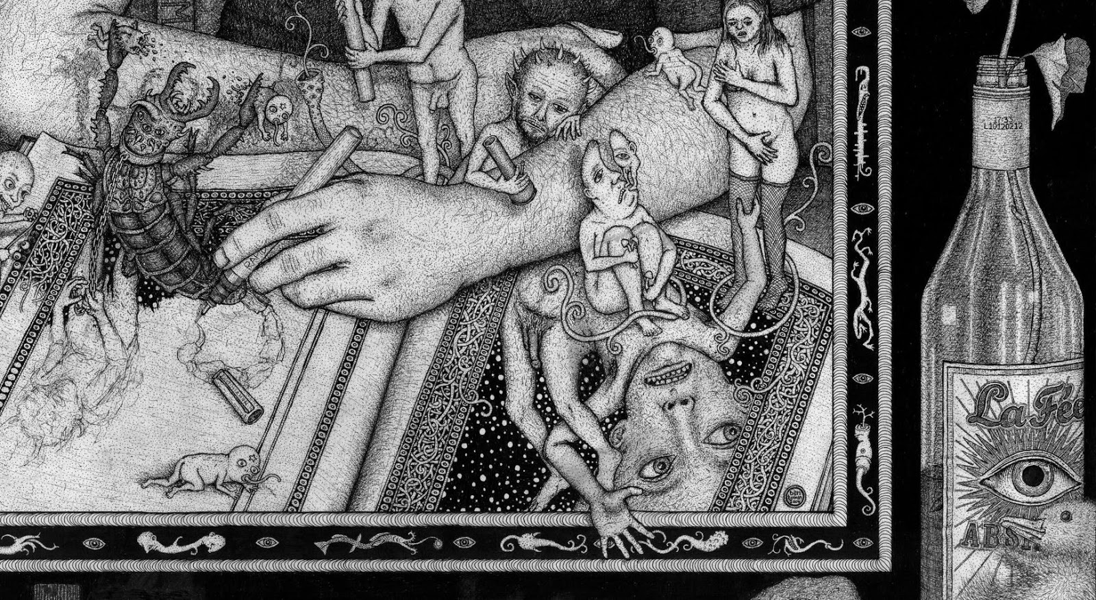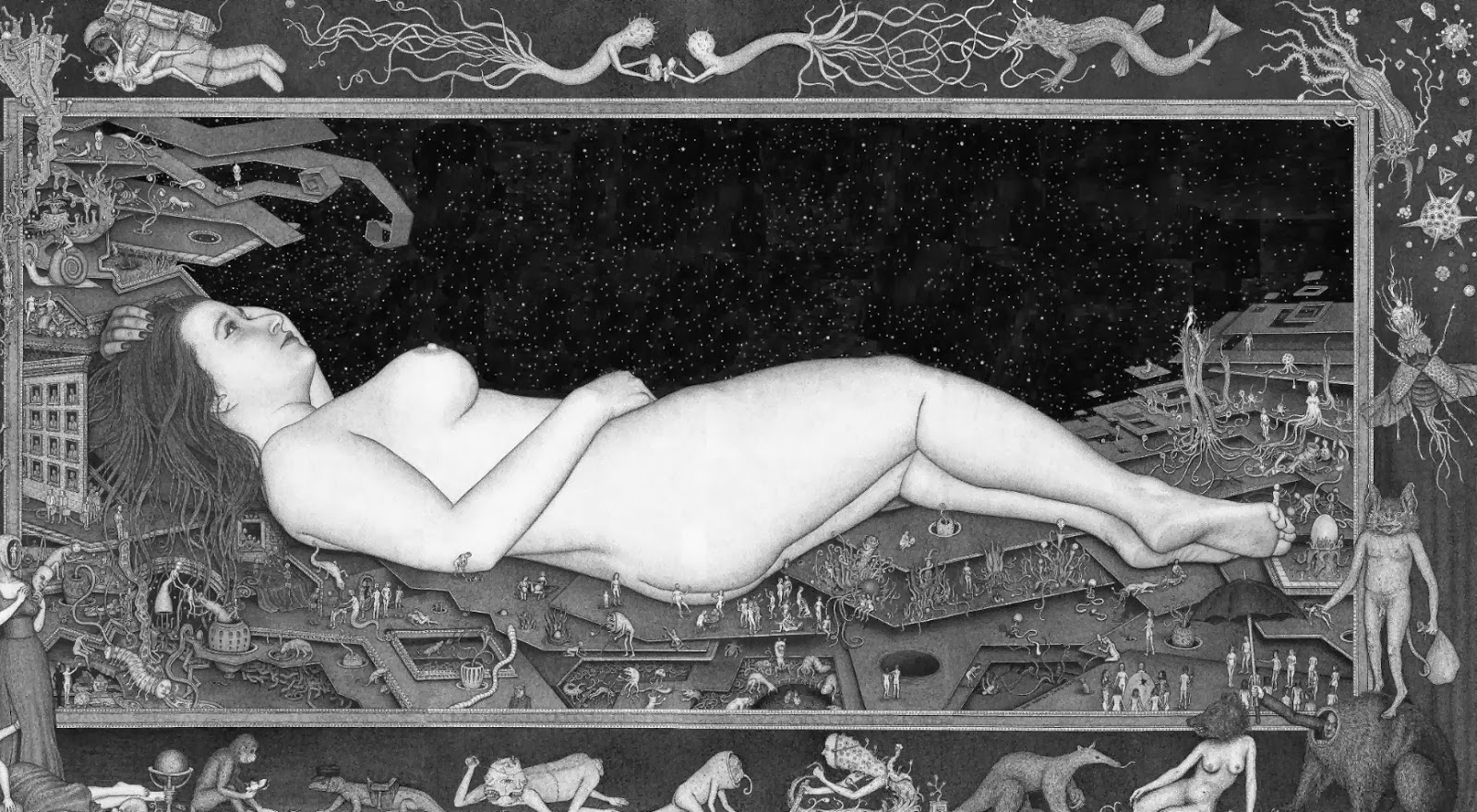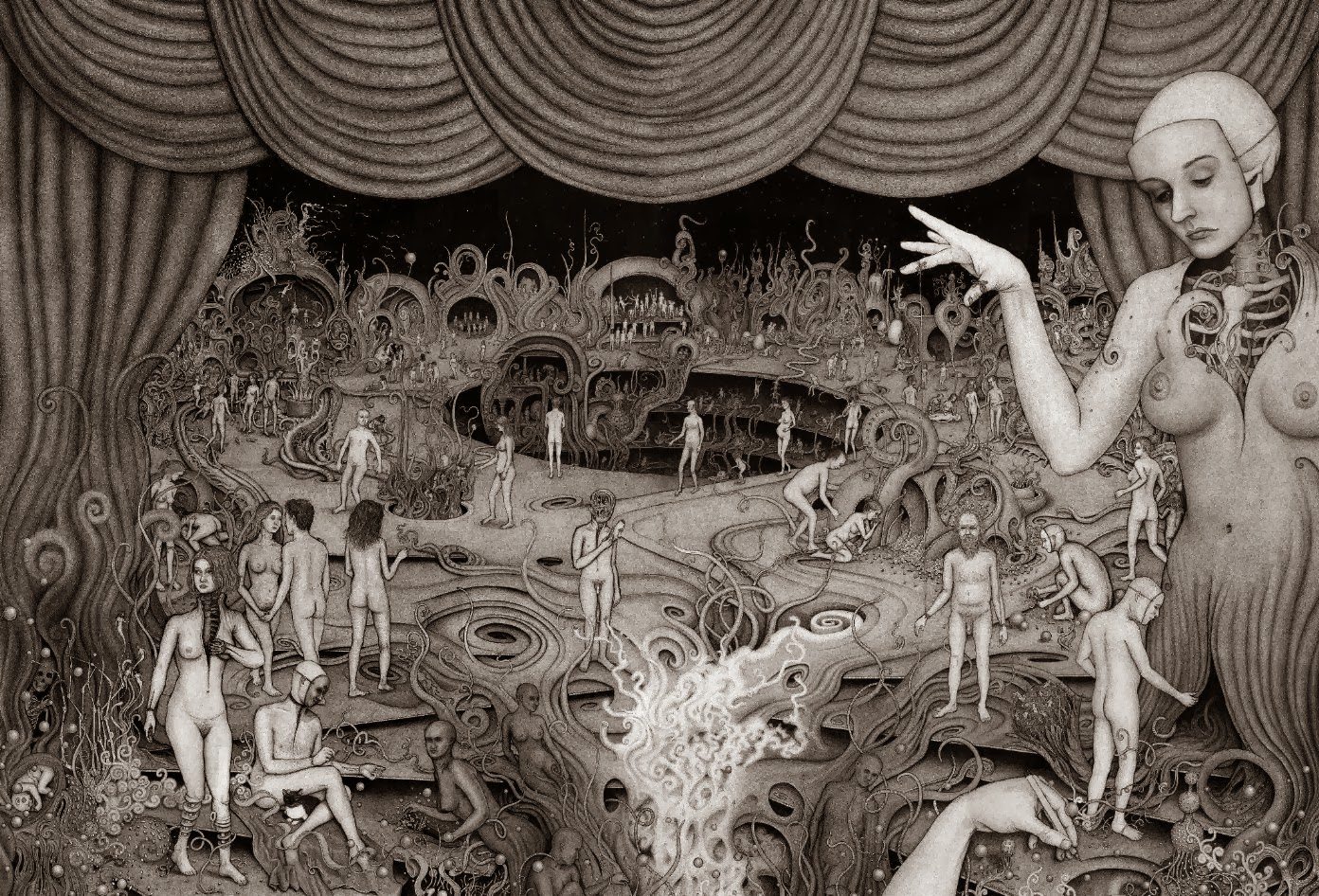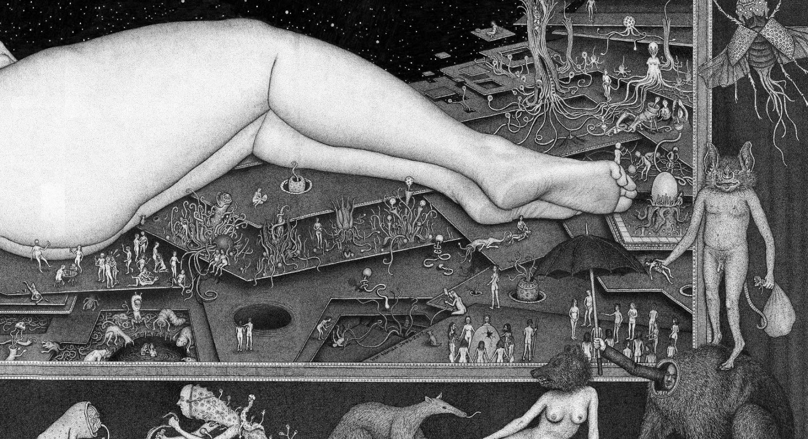 Through art, I create a space for myself to slow down and reflect on this unlikely experience I am embedded within. I am fascinated by with the juxtapositions of the mundane patterns of everyday life and the extraordinary peculiarity of life itself. While going through the repetition of everyday tasks it is easy to forget just how strange and complex life is. I am in constant amazement that life works and this whole unlikely project of existence continues to unfold so flawlessly. In a world that’s constantly moving faster and faster my meticulous ink drawings allow me the space to slow down and explore my circumstances. I was raised in a conservative Mormon family. The meaning of life came in a neat packaged box but fell apart with the slightest bit of scrutiny. Long ago as a child, I abandoned any existing cultural mythology as an explanation for life and have been exploring this mystery, and creating my own mythology through art, ever since. Without any prepackaged creation stories, I have the freedom to just reflect on the mystery, beauty and horror of it all without any prejudice. The more I learn, the stranger everything becomes. But this grandeur of possible thoughts and experiences has to still be tempered with the same mundane tasks and struggles of the daily slog through life that has always been with mankind. The slow process of dense ink drawings allows time to dig out a more subtle understanding of my circumstance and embed that in my work. In my recent work I am exploring the spaces I, and we as a culture, create and inhabit. I am interested in how our constructed environment limits us as well as offering us possibilities. Within this constructed environment, I am further interested in the peculiarities of the individual in relation to the larger culture.