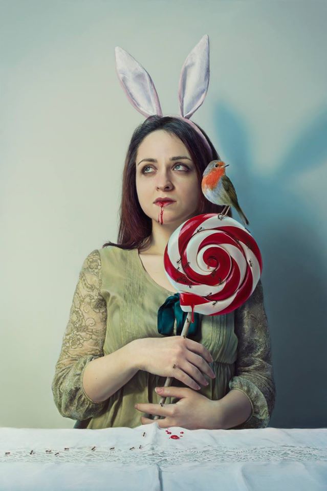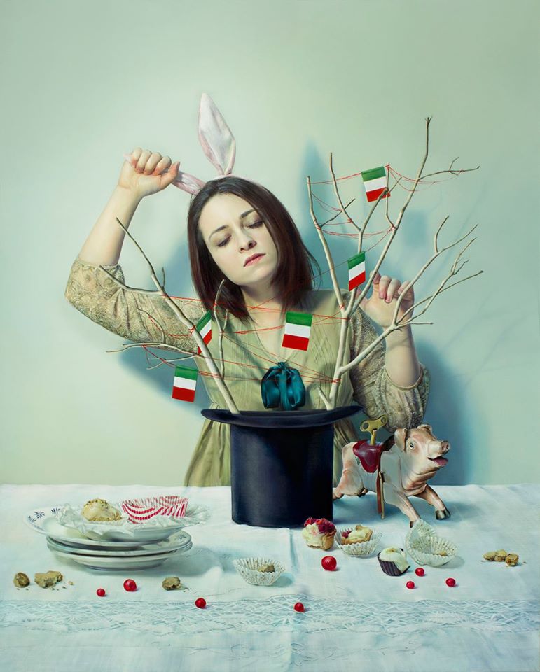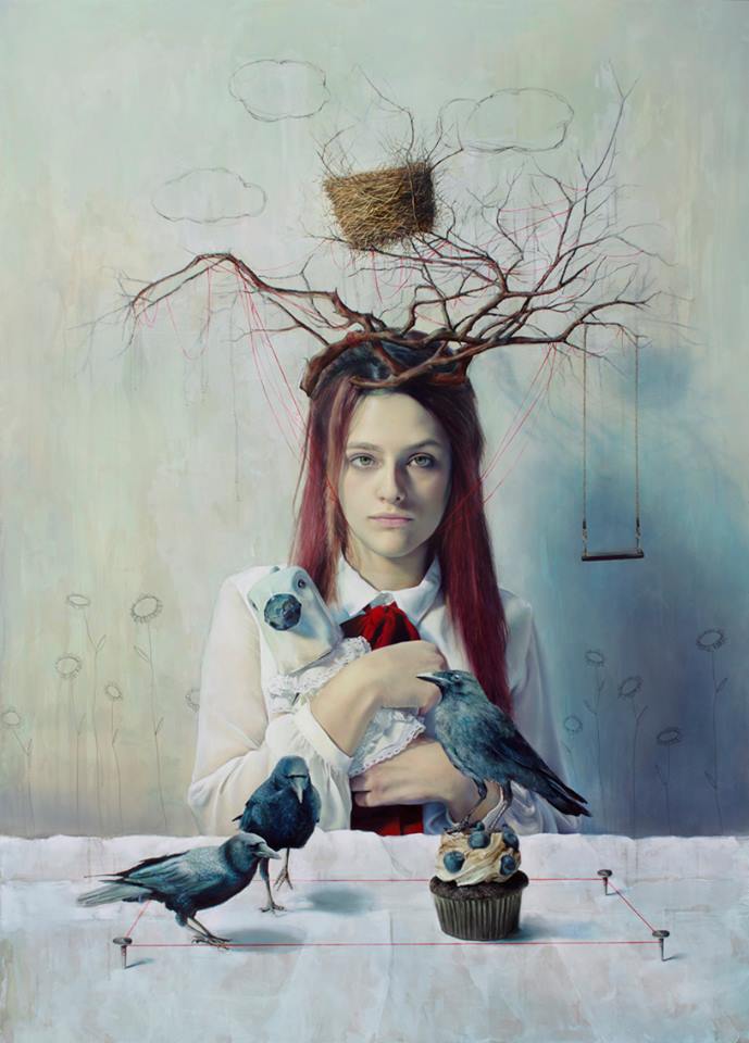 Le favole di cui si nutre la nostra artista sono intrise tuttavia di realtà; una realtà che si riversa sulle sue tele, spazi bianchi su cui creare, e pur si pone davanti agli occhi di chi non l’ha ancora affrontata: “E così cappuccetto rosso ci parla di quanto la fiducia ci renda ciechi e ci impedisce di vedere anche le cose più evidenti. E Alice vive la tragedia del sentirsi sempre inadeguata, troppo grande, troppo piccola, mai della giusta misura. Inadeguata persino nel mondo da lei stessa creato. I pericoli peggiori sono proprio dentro di noi. E ancora Karen, la bambina di “scarpette rosse” di Andersen ci insegna che ciò che tanto desideriamo non sempre è poi ciò di cui abbiamo bisogno e che può renderci felici.”