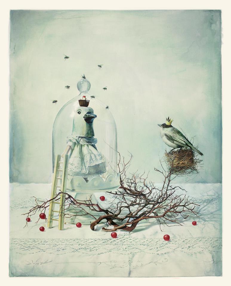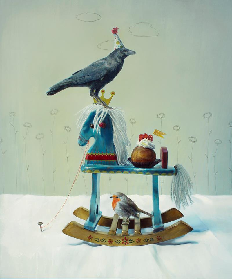Immaginate quattro mura vuote, bianche, fredde. Elisa pennello e pensieri in mano e la tela che prende vita al ritmo, di sogni favole e realtà. I suoi quadri si riversano dentro stanze che riempie d’oggetti e simboli. Le stanze sono esse stesse rifugio e prigione. Il tempo dell’infanzia, poiché l’infanzia non è solo un tempo, ma anche un luogo: il meraviglioso luogo del ricordo. Quel posto che ti mette al riparo, come un tetto, durante una pioggia fredda e fitta di realtà, da tutto il resto ed un rifugio che può diventare anche prigione quando è l’alibi per non voler più uscir fuori. Perché si ha paura. Ci si lascia vincere dalla mancanza di coraggio, lì inerti e inermi.