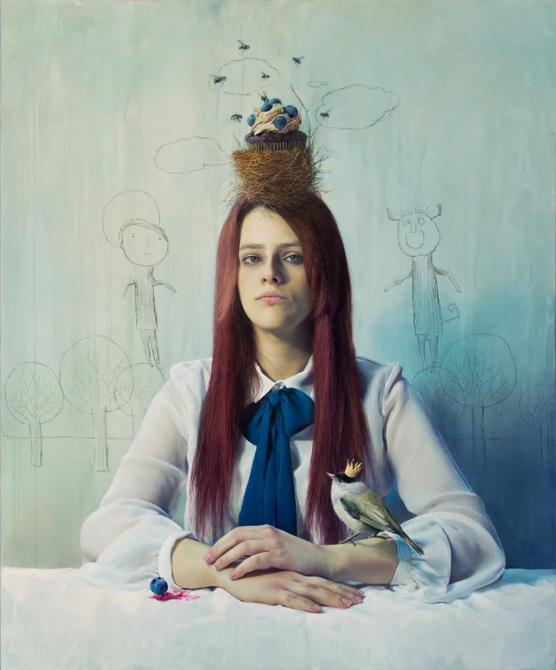 Lei è un’artista. Racconta favole, dipinge realtà. Una cantastorie su tela. Quello che immediatamente accade di fronte alle opere di Elisa Anfuso è che ti accompagnano per mano, lentamente, verso un mondo indefinito e intenso, fatto di simboli e favole. Ti trovi lì a respirare un non so ché di fantastico, fors’anche il mondo di una donna disincantata che si rifugia in pensieri da bambina, i quali si increspano su carta abitata da alti papaveri, piccoli dolci, capelli che si intrecciano, favole che si schiudono, uccellini che spiccano il volo, il tutto incorniciato su tela. Danno vita all’immaginazione di ognuno, risvegliano déjà vu, domande, ispirazioni sopite.