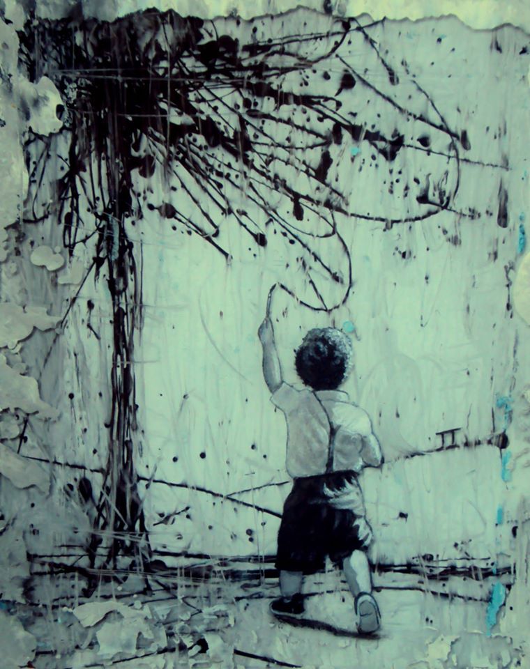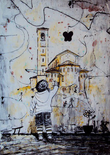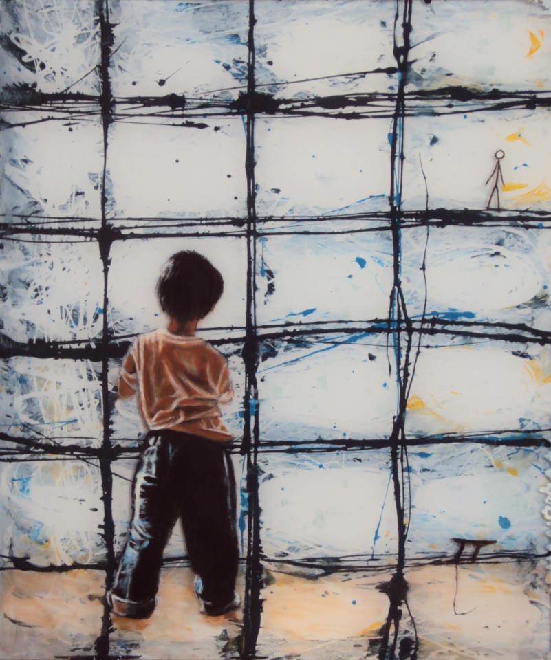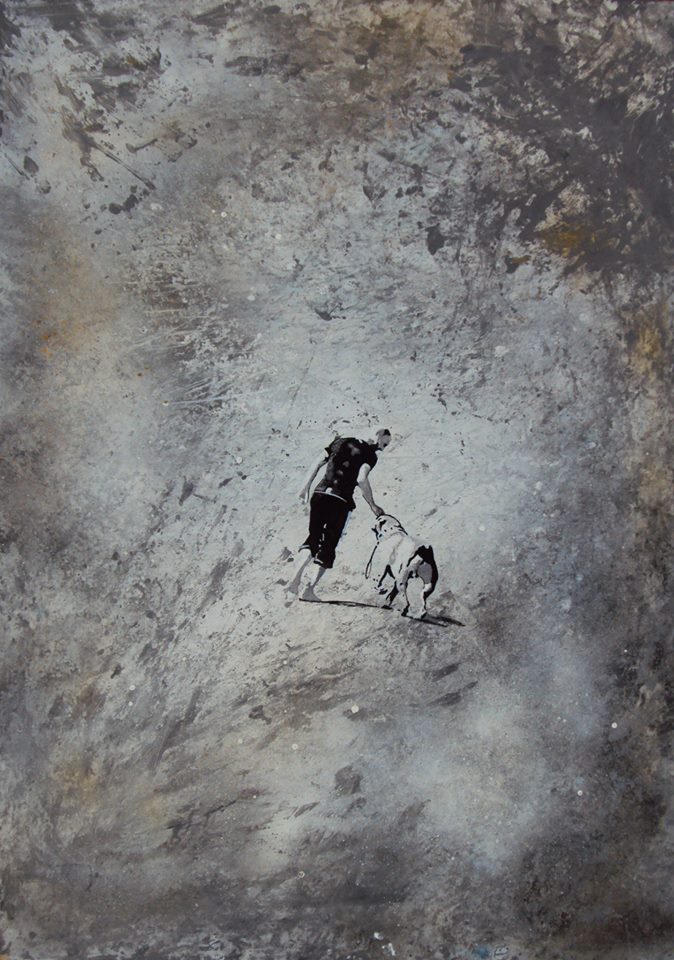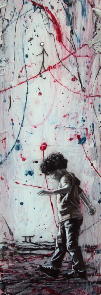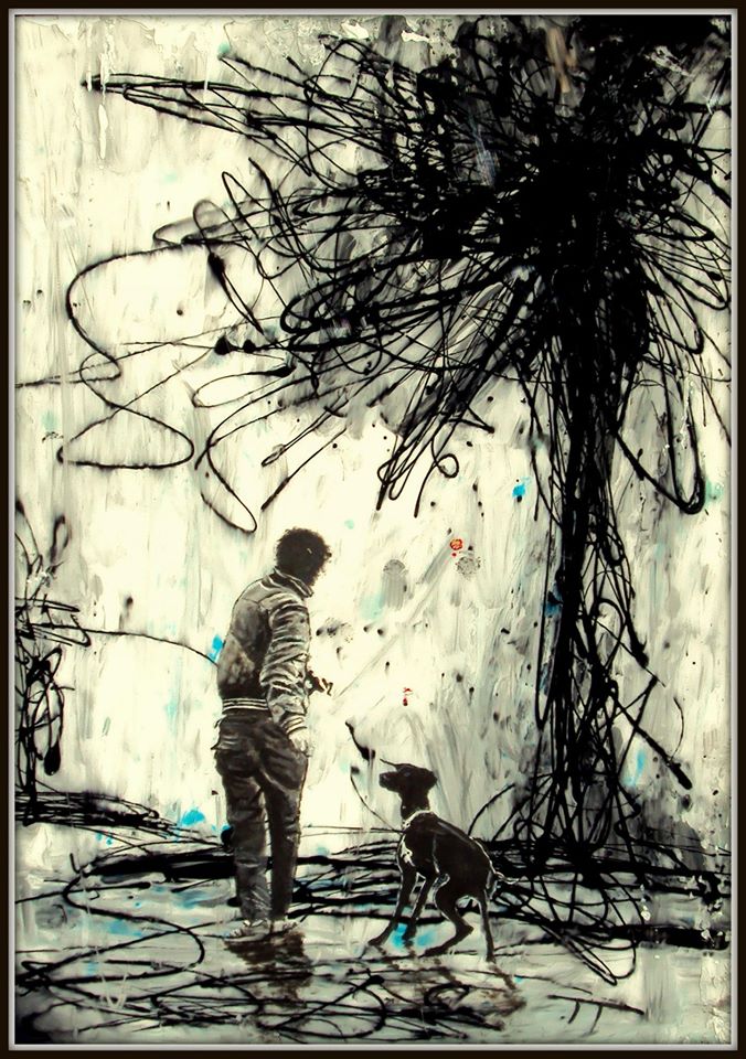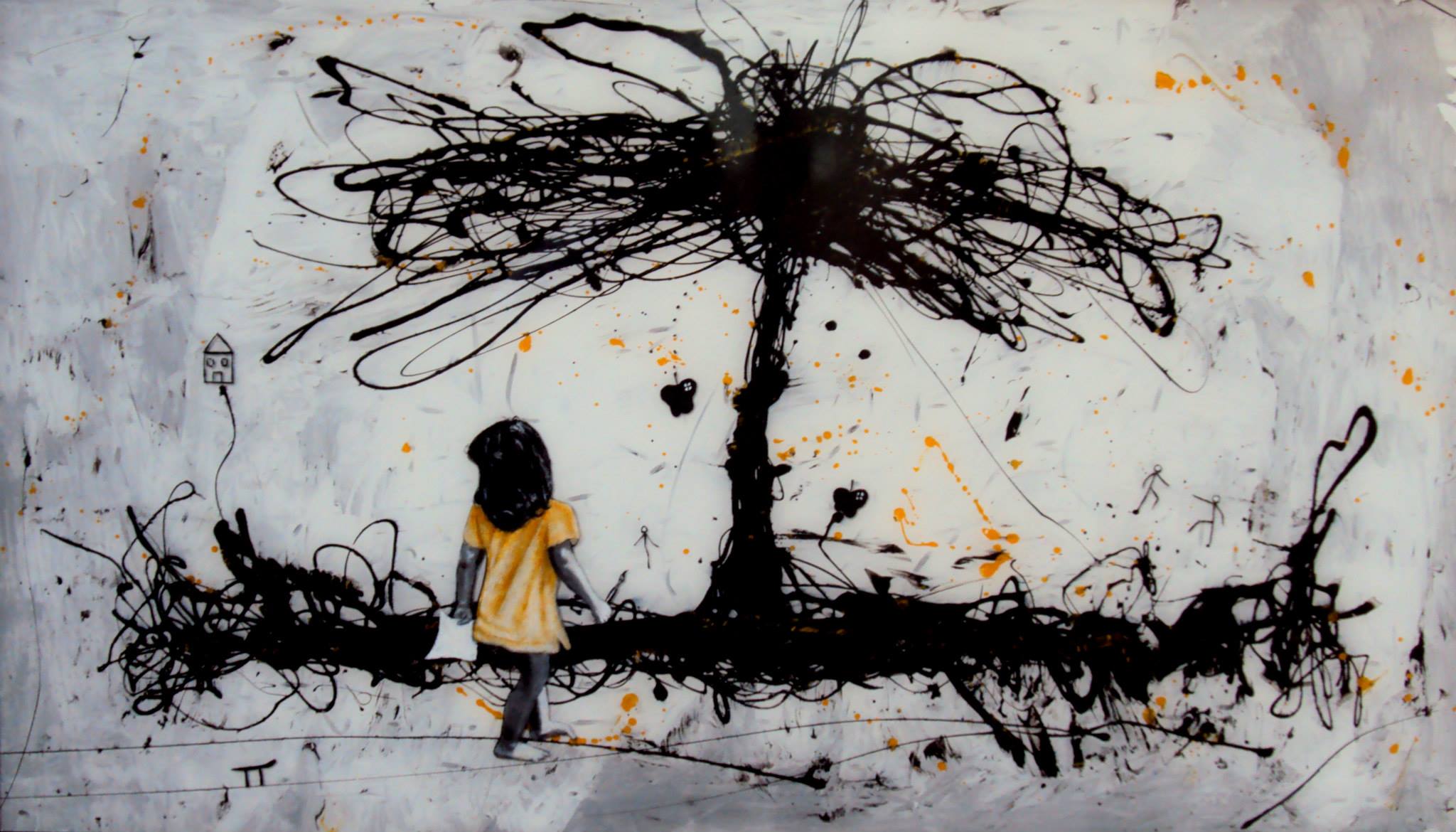 Lorenzo Villa descrive sogni, e lo fa accostando diversi livelli semiotici, inserendo i personaggi in uno scenario moderno eppure indefinito e onirico. Sono bambini e ragazze che camminano e danzano per le strade della periferia urbana, carichi della grazia e del peso delle idee. I pensieri si traducono in messaggi tracciati rapidamente su di una nuova superficie scabra, utile a esprimere l’urgenza delle emozioni. In questo mondo d’intrecci, non c’è spazio per le elaborazioni concettuali: basta una singola parola, uno slogan per trasmettere il significato essenziale do ciò che agita la società. Lo sguardo si sofferma su un frame che blocca un istante fotografico, catturando tutto il dinamismo de un’azione, ma il percorso degli individui si spinge verso altri panorami, questa volta interiori. Ci si ritrova così a contemplare una valle spoglia, (l’esatto contrario della città brulicante), dove solo un albero stilizzato e nervoso, diventa insieme riparo e concretizzazione dell’incertezza psicologica, come se il flusso elettrico dell’attività neuronale si fosse manifestato in una selva di tratti veloci ed esplosivi, vicino al linguaggio del fumetto d’autore. I cani, una bimba, un uomo… i protagonisti sono fermi davanti all’orizzonte, quasi in attesa di Godot e la loro mente si apre al futuro e si chiude in una riflessione totalmente privata. In ogni caso resta un leggero alone spirituale che modula la declinazione dei desideri e di una bellezza ermetica, sfiora la trascendenza mistica di un portale perso in lontananza o si distingue nelle forme scherzosamente ritagliate nella natura. L’uso bilanciato di pochi colori, che spiccano sui toni del bianco e nero, sottolinea il duplice spostamento, (reale e metaforico), e il ritorno costante di alcuni elementi chiave: è un lavoro di sottrazione che sembra voler dar corpo e movimento a quelle immagini che nascono dal fondo della coscienza e s’imprimo sulla retina. L’utilizzo di materiali innovativi dà allo spettatore l’impressione di poter toccare la magia delle lastre lisce e modernissime che si possono porre in sequenza per ricostruire un codice che mescola l’attenzione al dettaglio figurativo e una deriva percettiva astratta.