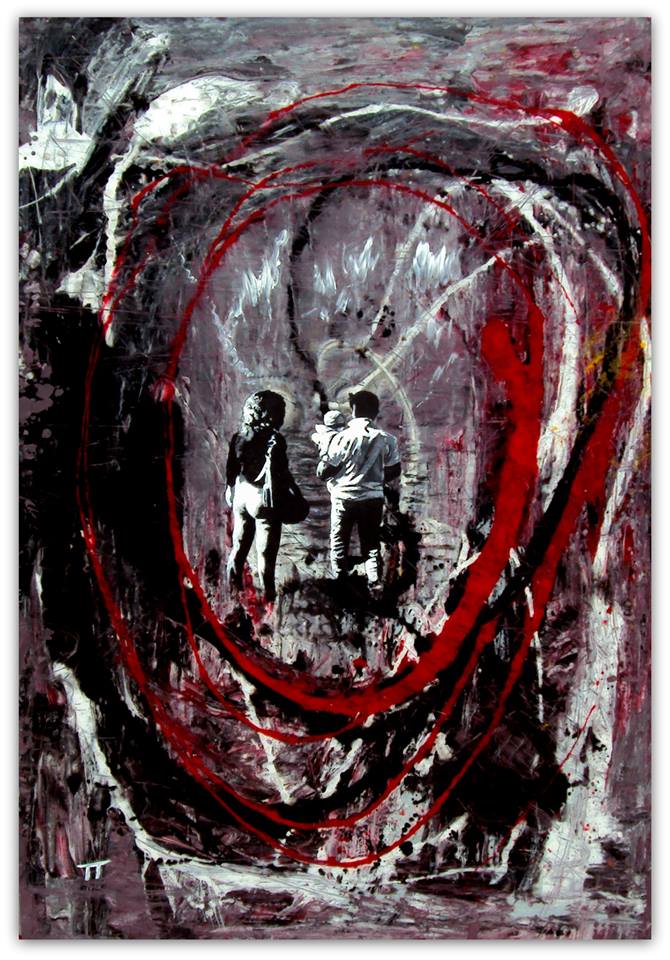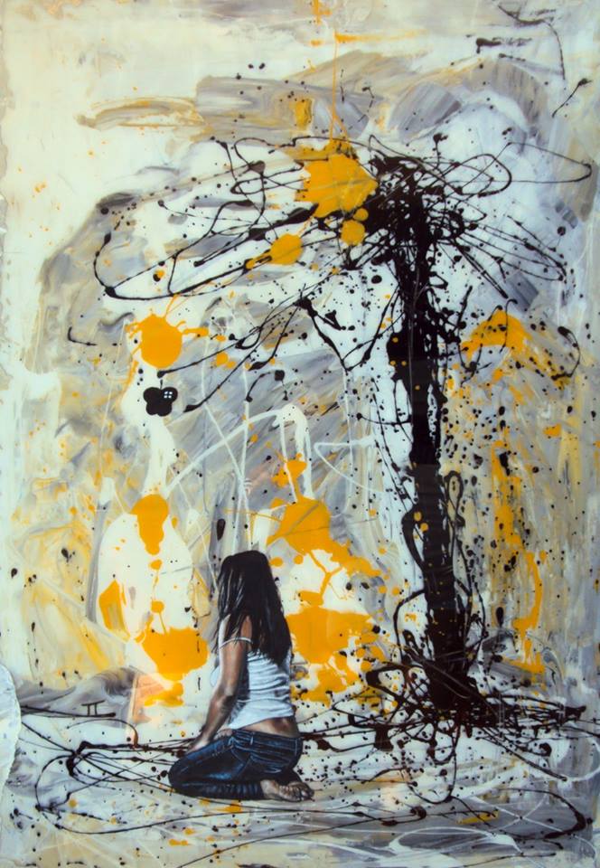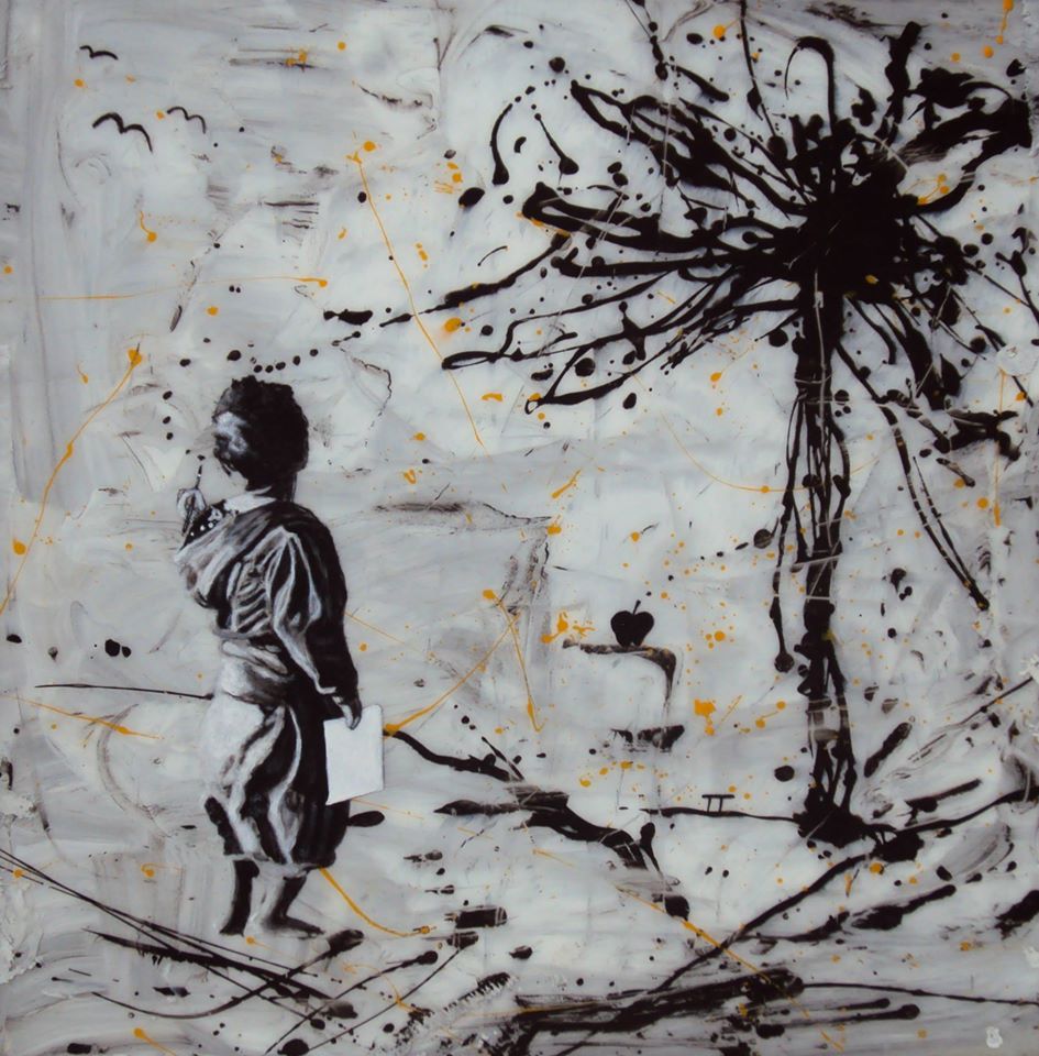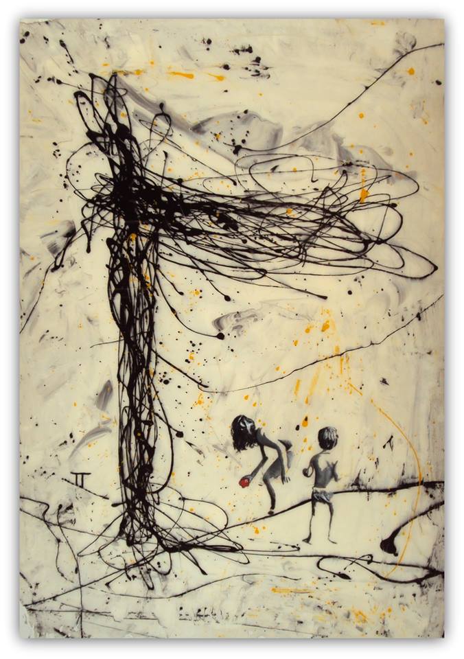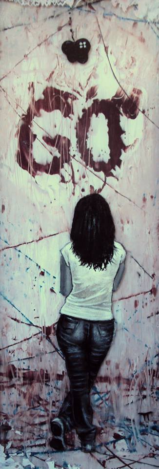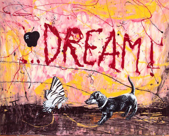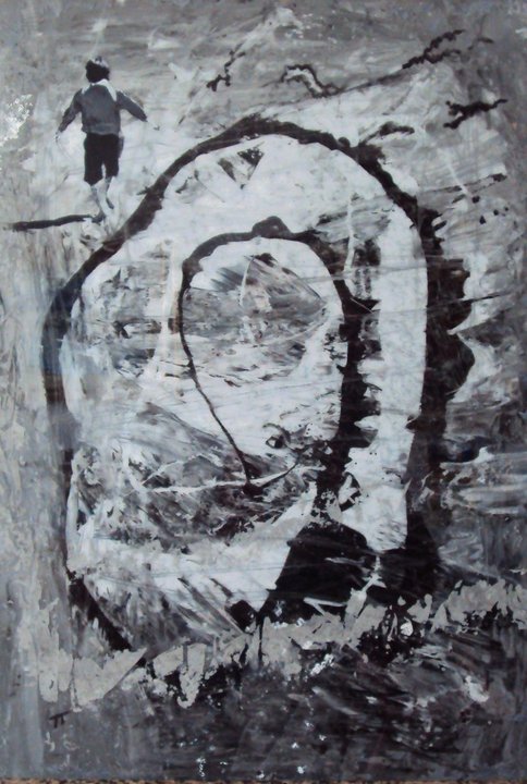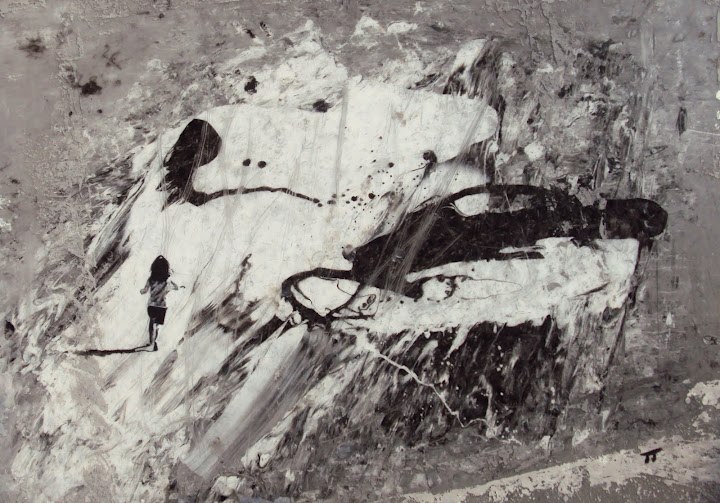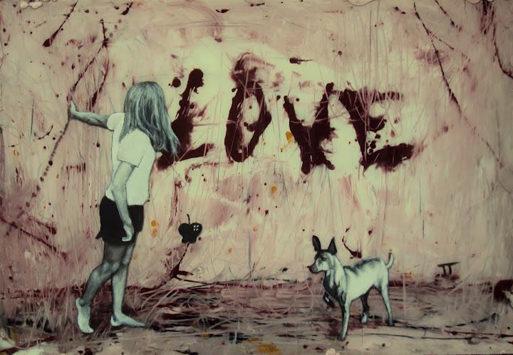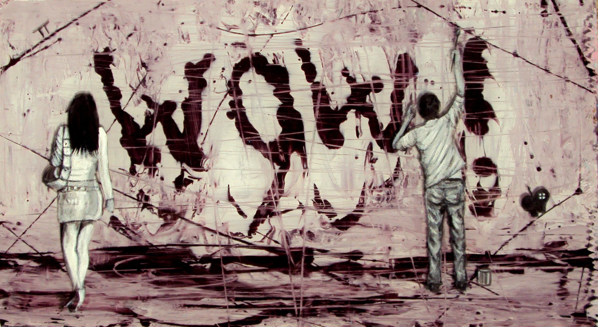 Lorenzo Villa descrive sogni, e lo fa accostando diversi livelli semiotici, inserendo i personaggi in uno scenario moderno eppure indefinito e onirico. Sono bambini e ragazze che camminano e danzano per le strade della periferia urbana, carichi della grazia e del peso delle idee. I pensieri si traducono in messaggi tracciati rapidamente su di una nuova superficie scabra, utile a esprimere l’urgenza delle emozioni. In questo mondo d’intrecci, non c’è spazio per le elaborazioni concettuali: basta una singola parola, uno slogan per trasmettere il significato essenziale do ciò che agita la società. Lo sguardo si sofferma su un frame che blocca un istante fotografico, catturando tutto il dinamismo de un’azione, ma il percorso degli individui si spinge verso altri panorami, questa volta interiori. Ci si ritrova così a contemplare una valle spoglia, (l’esatto contrario della città brulicante), dove solo un albero stilizzato e nervoso, diventa insieme riparo e concretizzazione dell’incertezza psicologica, come se il flusso elettrico dell’attività neuronale si fosse manifestato in una selva di tratti veloci ed esplosivi, vicino al linguaggio del fumetto d’autore. I cani, una bimba, un uomo… i protagonisti sono fermi davanti all’orizzonte, quasi in attesa di Godot e la loro mente si apre al futuro e si chiude in una riflessione totalmente privata. In ogni caso resta un leggero alone spirituale che modula la declinazione dei desideri e di una bellezza ermetica, sfiora la trascendenza mistica di un portale perso in lontananza o si distingue nelle forme scherzosamente ritagliate nella natura. L’uso bilanciato di pochi colori, che spiccano sui toni del bianco e nero, sottolinea il duplice spostamento, (reale e metaforico), e il ritorno costante di alcuni elementi chiave: è un lavoro di sottrazione che sembra voler dar corpo e movimento a quelle immagini che nascono dal fondo della coscienza e s’imprimo sulla retina. L’utilizzo di materiali innovativi dà allo spettatore l’impressione di poter toccare la magia delle lastre lisce e modernissime che si possono porre in sequenza per ricostruire un codice che mescola l’attenzione al dettaglio figurativo e una deriva percettiva astratta.