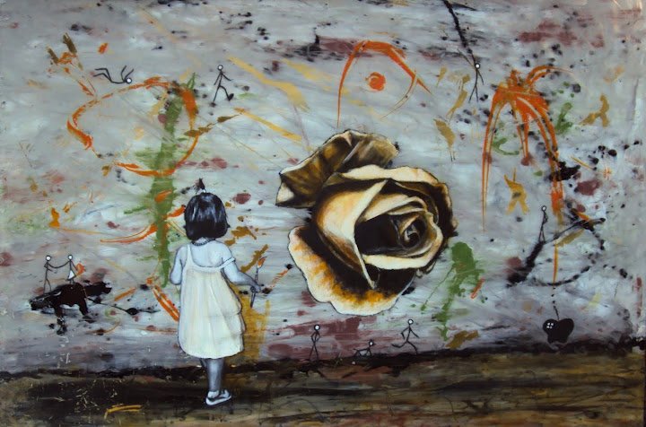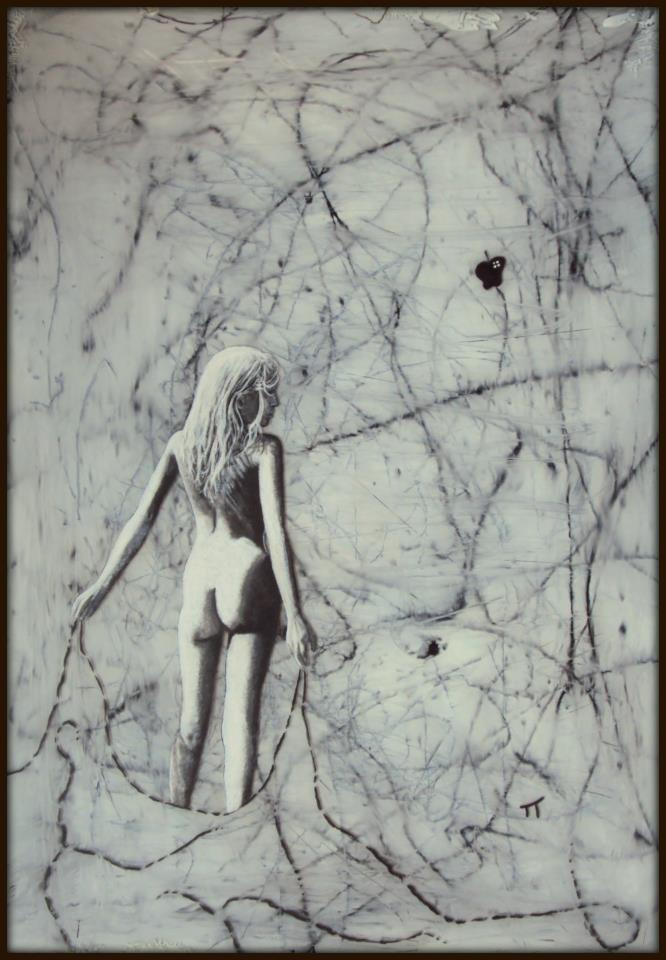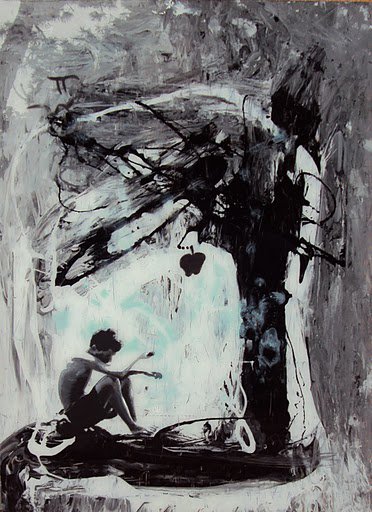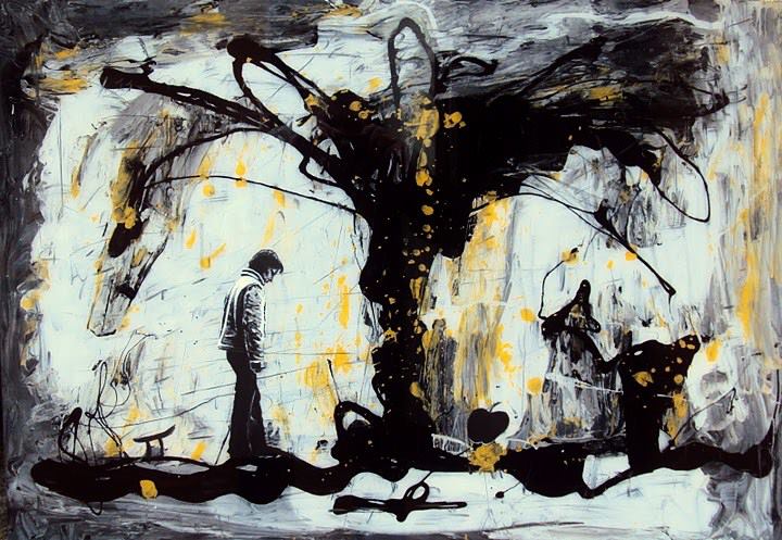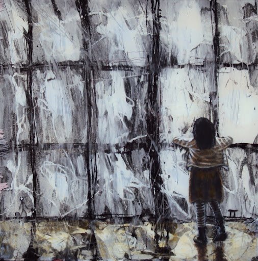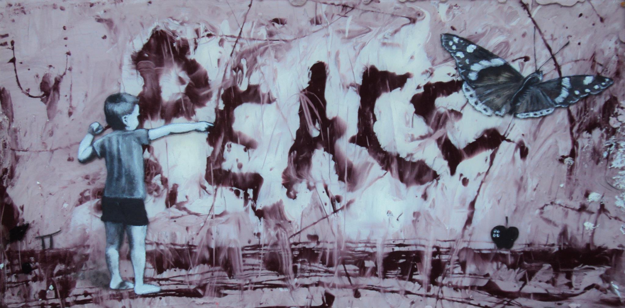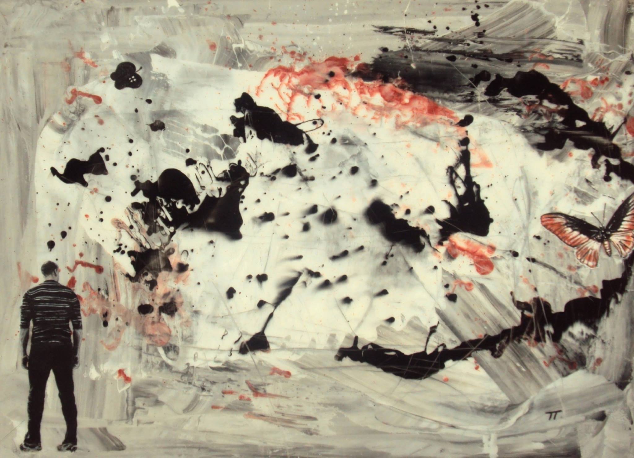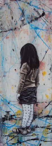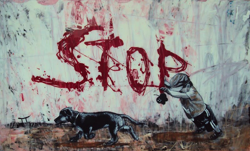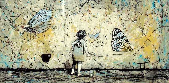 Lorenzo Villa descrive sogni, e lo fa accostando diversi livelli semiotici, inserendo i personaggi in uno scenario moderno eppure indefinito e onirico. Sono bambini e ragazze che camminano e danzano per le strade della periferia urbana, carichi della grazia e del peso delle idee. I pensieri si traducono in messaggi tracciati rapidamente su di una nuova superficie scabra, utile a esprimere l’urgenza delle emozioni. In questo mondo d’intrecci, non c’è spazio per le elaborazioni concettuali: basta una singola parola, uno slogan per trasmettere il significato essenziale do ciò che agita la società. Lo sguardo si sofferma su un frame che blocca un istante fotografico, catturando tutto il dinamismo de un’azione, ma il percorso degli individui si spinge verso altri panorami, questa volta interiori. Ci si ritrova così a contemplare una valle spoglia, (l’esatto contrario della città brulicante), dove solo un albero stilizzato e nervoso, diventa insieme riparo e concretizzazione dell’incertezza psicologica, come se il flusso elettrico dell’attività neuronale si fosse manifestato in una selva di tratti veloci ed esplosivi, vicino al linguaggio del fumetto d’autore. I cani, una bimba, un uomo… i protagonisti sono fermi davanti all’orizzonte, quasi in attesa di Godot e la loro mente si apre al futuro e si chiude in una riflessione totalmente privata. In ogni caso resta un leggero alone spirituale che modula la declinazione dei desideri e di una bellezza ermetica, sfiora la trascendenza mistica di un portale perso in lontananza o si distingue nelle forme scherzosamente ritagliate nella natura. L’uso bilanciato di pochi colori, che spiccano sui toni del bianco e nero, sottolinea il duplice spostamento, (reale e metaforico), e il ritorno costante di alcuni elementi chiave: è un lavoro di sottrazione che sembra voler dar corpo e movimento a quelle immagini che nascono dal fondo della coscienza e s’imprimo sulla retina. L’utilizzo di materiali innovativi dà allo spettatore l’impressione di poter toccare la magia delle lastre lisce e modernissime che si possono porre in sequenza per ricostruire un codice che mescola l’attenzione al dettaglio figurativo e una deriva percettiva astratta.