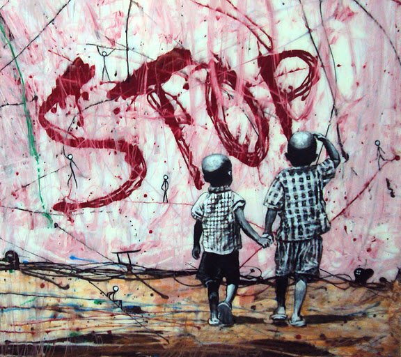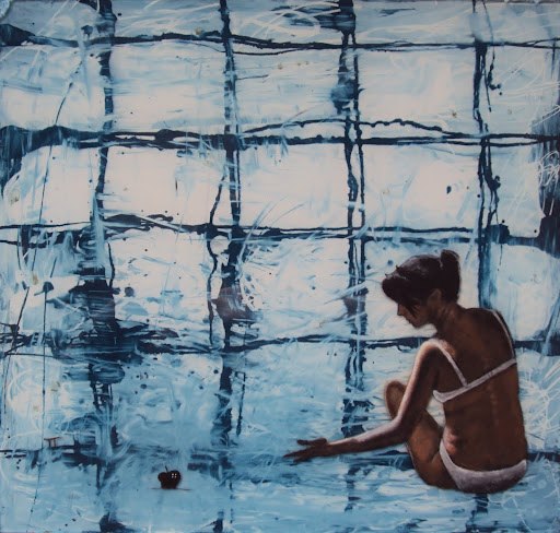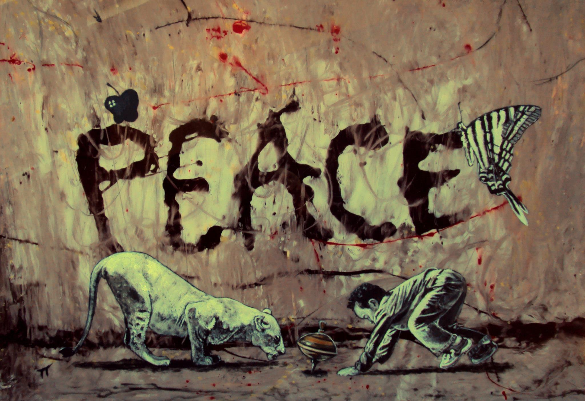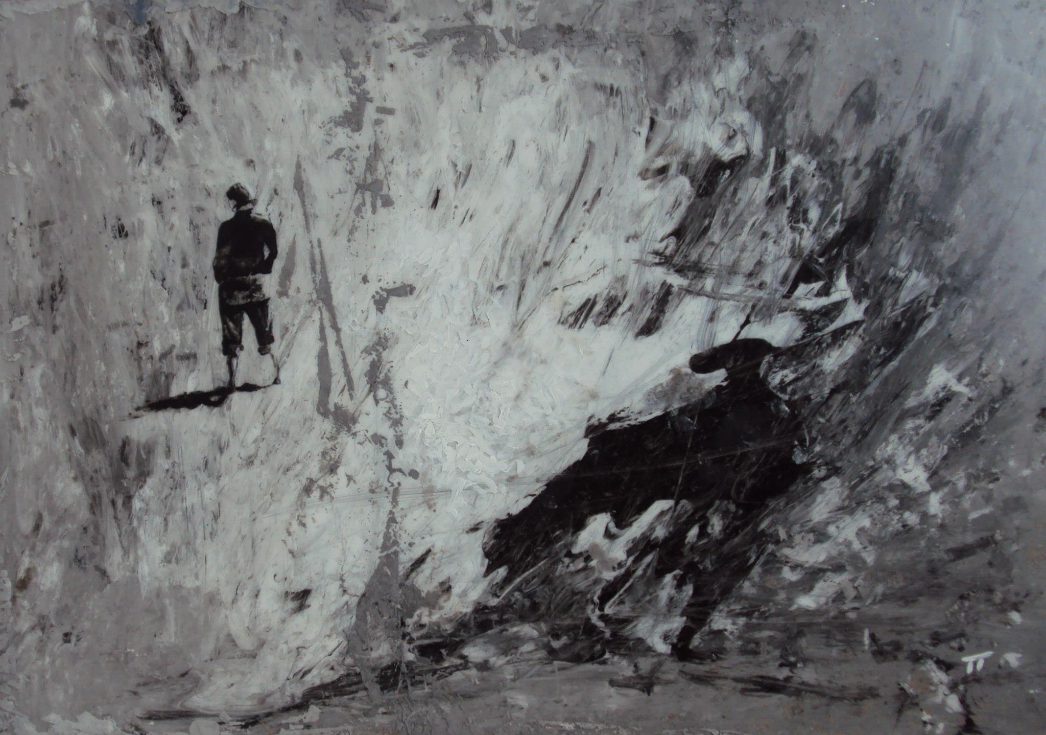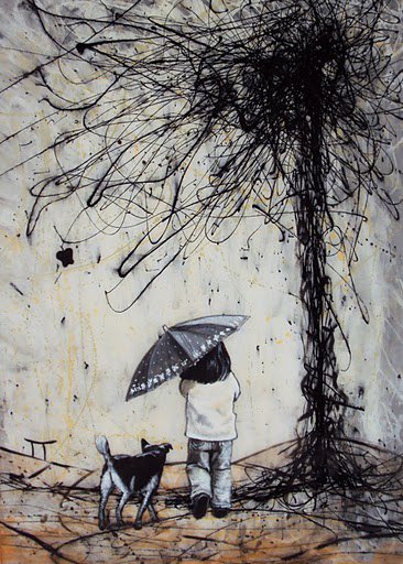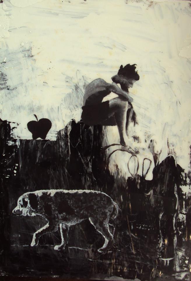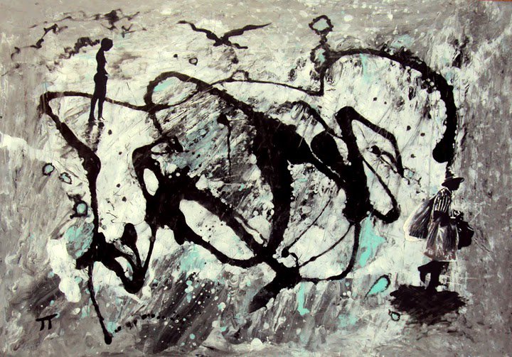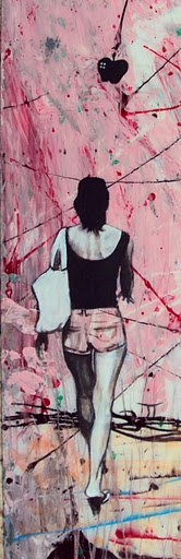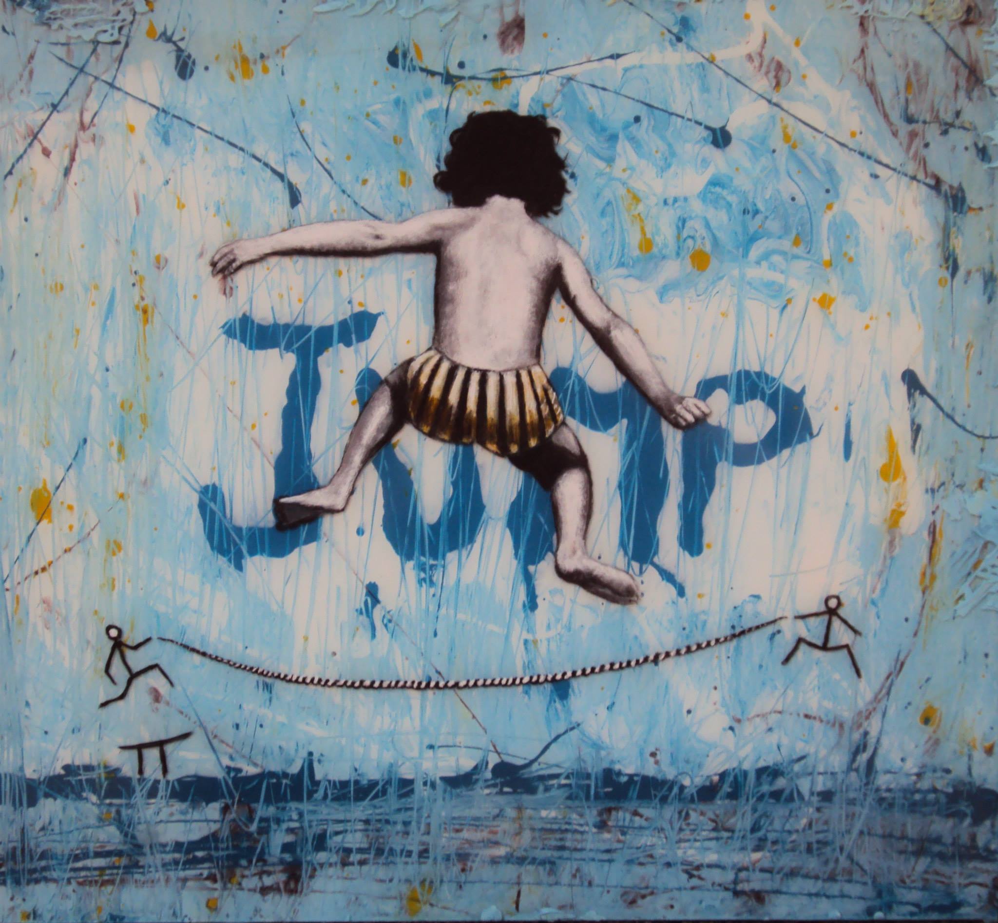 Lorenzo Villa descrive sogni, e lo fa accostando diversi livelli semiotici, inserendo i personaggi in uno scenario moderno eppure indefinito e onirico. Sono bambini e ragazze che camminano e danzano per le strade della periferia urbana, carichi della grazia e del peso delle idee. I pensieri si traducono in messaggi tracciati rapidamente su di una nuova superficie scabra, utile a esprimere l’urgenza delle emozioni. In questo mondo d’intrecci, non c’è spazio per le elaborazioni concettuali: basta una singola parola, uno slogan per trasmettere il significato essenziale do ciò che agita la società. Lo sguardo si sofferma su un frame che blocca un istante fotografico, catturando tutto il dinamismo de un’azione, ma il percorso degli individui si spinge verso altri panorami, questa volta interiori. Ci si ritrova così a contemplare una valle spoglia, (l’esatto contrario della città brulicante), dove solo un albero stilizzato e nervoso, diventa insieme riparo e concretizzazione dell’incertezza psicologica, come se il flusso elettrico dell’attività neuronale si fosse manifestato in una selva di tratti veloci ed esplosivi, vicino al linguaggio del fumetto d’autore. I cani, una bimba, un uomo… i protagonisti sono fermi davanti all’orizzonte, quasi in attesa di Godot e la loro mente si apre al futuro e si chiude in una riflessione totalmente privata. In ogni caso resta un leggero alone spirituale che modula la declinazione dei desideri e di una bellezza ermetica, sfiora la trascendenza mistica di un portale perso in lontananza o si distingue nelle forme scherzosamente ritagliate nella natura. L’uso bilanciato di pochi colori, che spiccano sui toni del bianco e nero, sottolinea il duplice spostamento, (reale e metaforico), e il ritorno costante di alcuni elementi chiave: è un lavoro di sottrazione che sembra voler dar corpo e movimento a quelle immagini che nascono dal fondo della coscienza e s’imprimo sulla retina. L’utilizzo di materiali innovativi dà allo spettatore l’impressione di poter toccare la magia delle lastre lisce e modernissime che si possono porre in sequenza per ricostruire un codice che mescola l’attenzione al dettaglio figurativo e una deriva percettiva astratta.