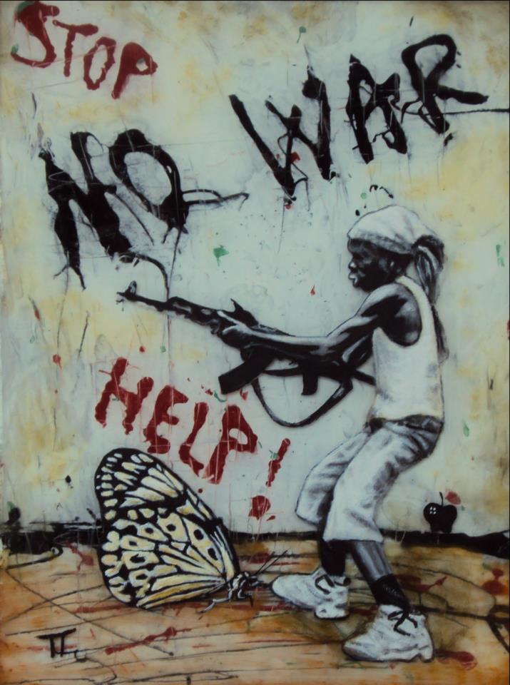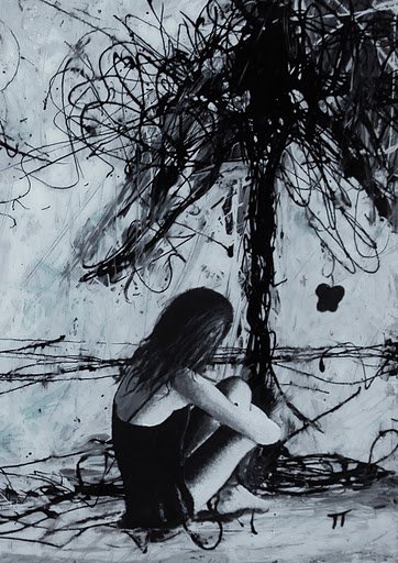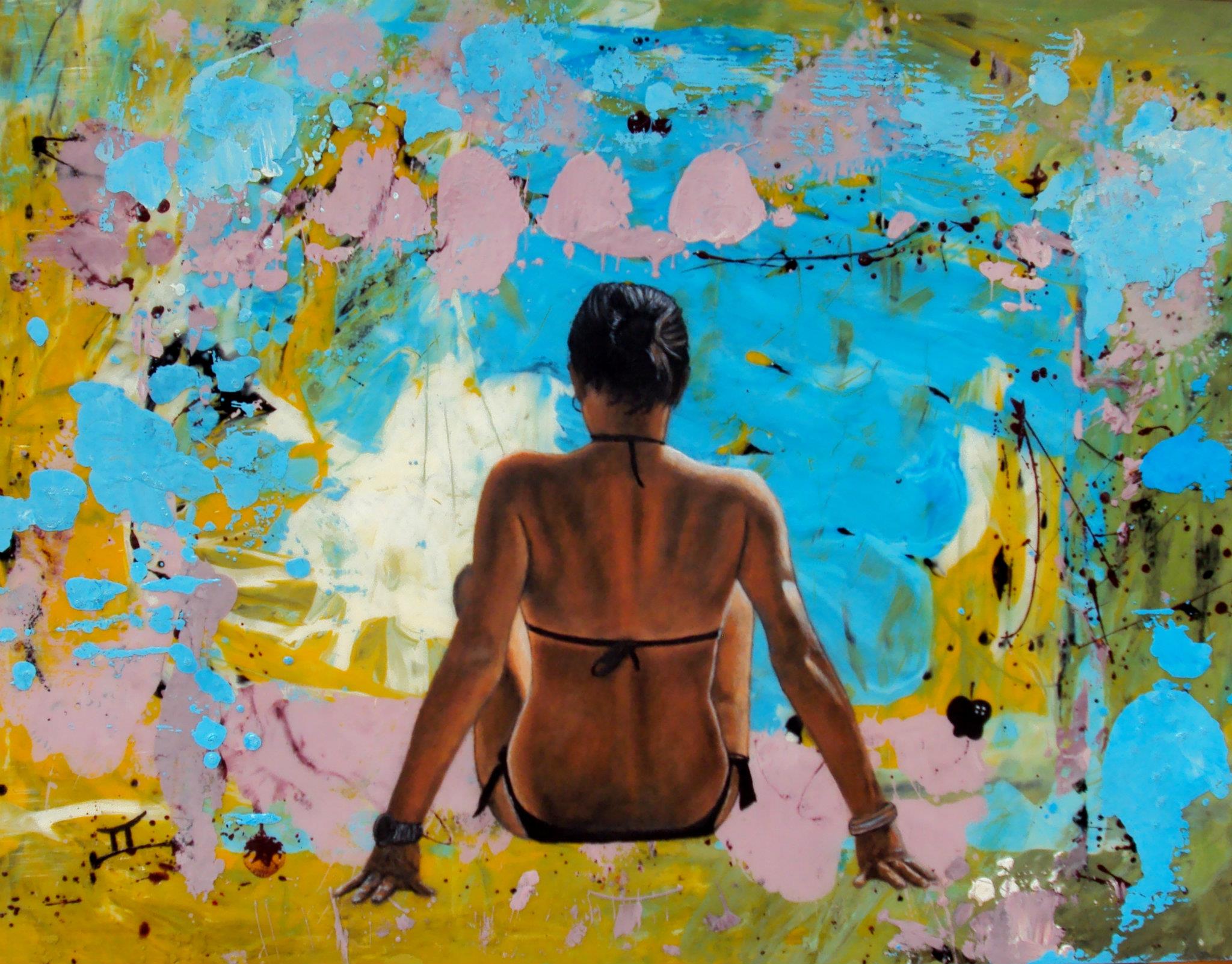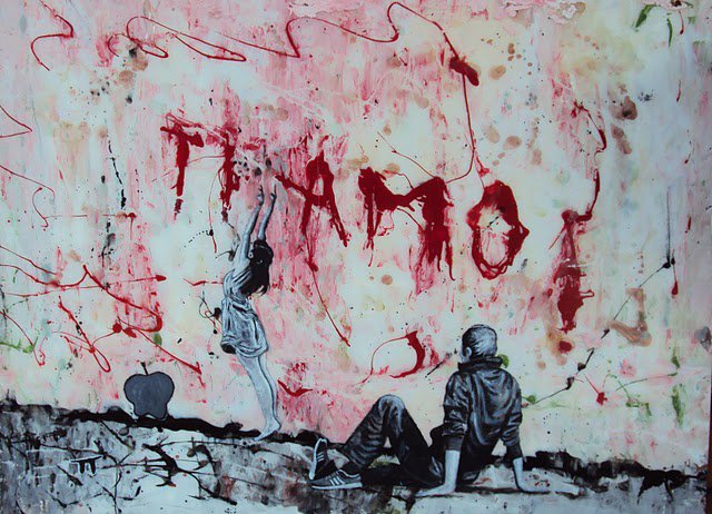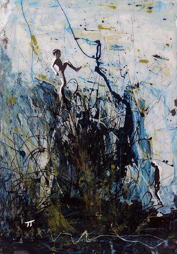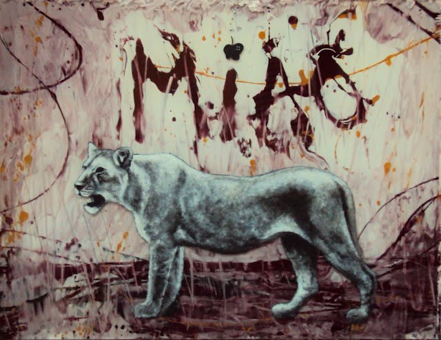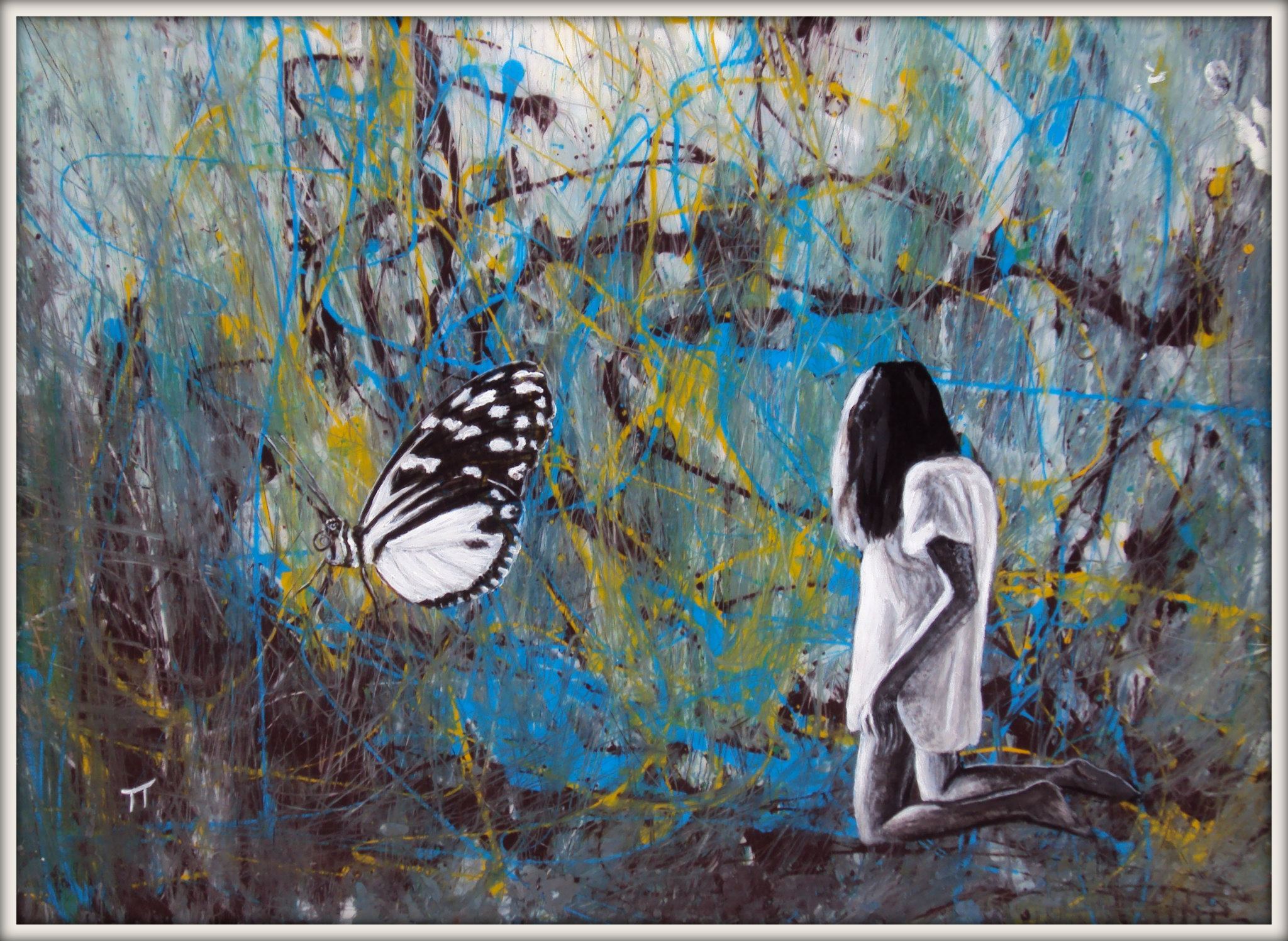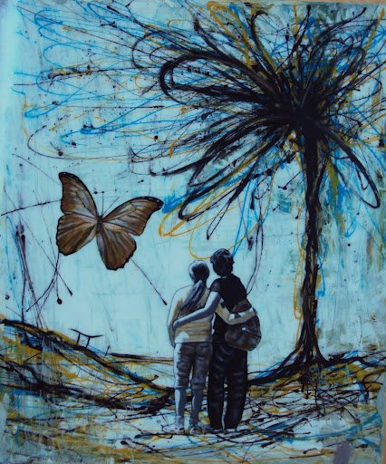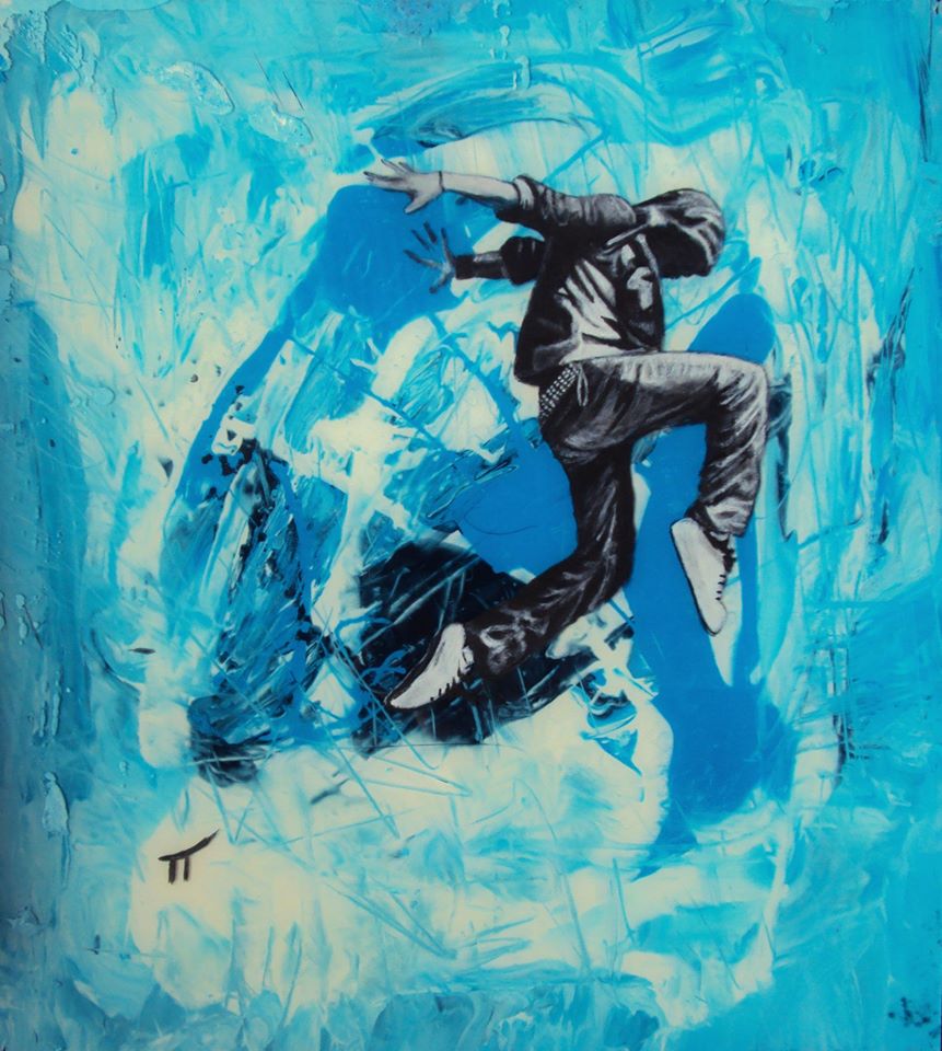 Lorenzo Villa descrive sogni, e lo fa accostando diversi livelli semiotici, inserendo i personaggi in uno scenario moderno eppure indefinito e onirico. Sono bambini e ragazze che camminano e danzano per le strade della periferia urbana, carichi della grazia e del peso delle idee. I pensieri si traducono in messaggi tracciati rapidamente su di una nuova superficie scabra, utile a esprimere l’urgenza delle emozioni. In questo mondo d’intrecci, non c’è spazio per le elaborazioni concettuali: basta una singola parola, uno slogan per trasmettere il significato essenziale do ciò che agita la società. Lo sguardo si sofferma su un frame che blocca un istante fotografico, catturando tutto il dinamismo de un’azione, ma il percorso degli individui si spinge verso altri panorami, questa volta interiori. Ci si ritrova così a contemplare una valle spoglia, (l’esatto contrario della città brulicante), dove solo un albero stilizzato e nervoso, diventa insieme riparo e concretizzazione dell’incertezza psicologica, come se il flusso elettrico dell’attività neuronale si fosse manifestato in una selva di tratti veloci ed esplosivi, vicino al linguaggio del fumetto d’autore. I cani, una bimba, un uomo… i protagonisti sono fermi davanti all’orizzonte, quasi in attesa di Godot e la loro mente si apre al futuro e si chiude in una riflessione totalmente privata. In ogni caso resta un leggero alone spirituale che modula la declinazione dei desideri e di una bellezza ermetica, sfiora la trascendenza mistica di un portale perso in lontananza o si distingue nelle forme scherzosamente ritagliate nella natura. L’uso bilanciato di pochi colori, che spiccano sui toni del bianco e nero, sottolinea il duplice spostamento, (reale e metaforico), e il ritorno costante di alcuni elementi chiave: è un lavoro di sottrazione che sembra voler dar corpo e movimento a quelle immagini che nascono dal fondo della coscienza e s’imprimo sulla retina. L’utilizzo di materiali innovativi dà allo spettatore l’impressione di poter toccare la magia delle lastre lisce e modernissime che si possono porre in sequenza per ricostruire un codice che mescola l’attenzione al dettaglio figurativo e una deriva percettiva astratta.