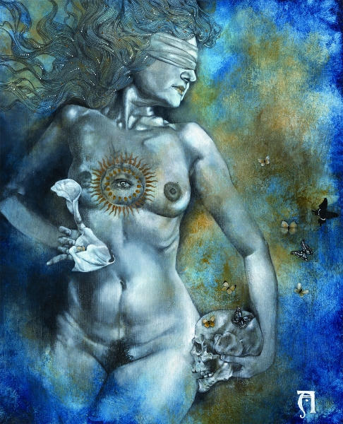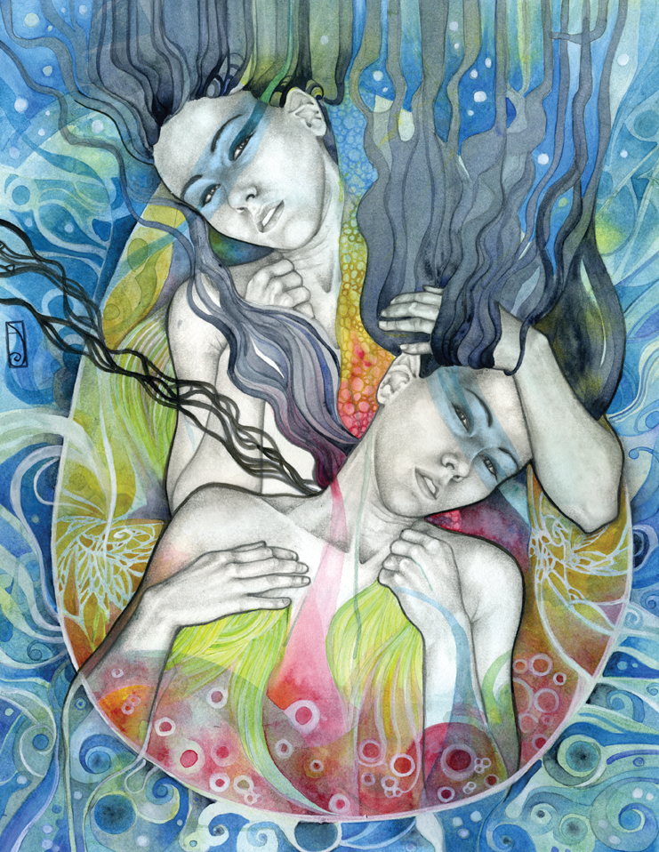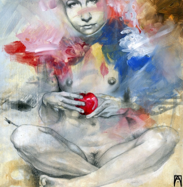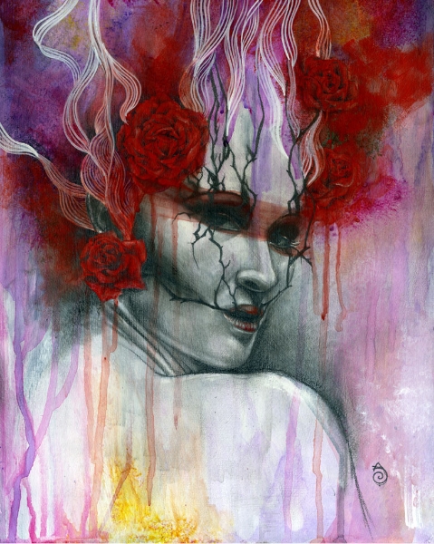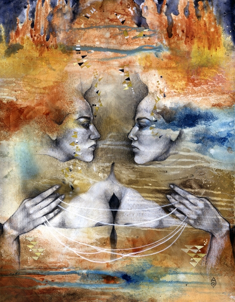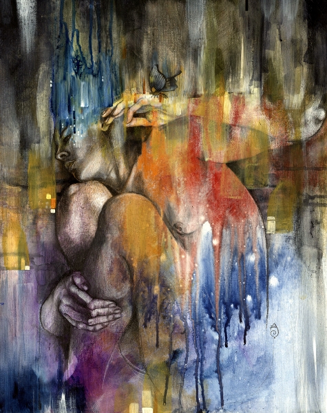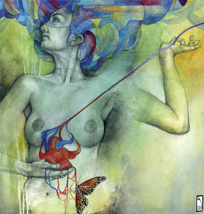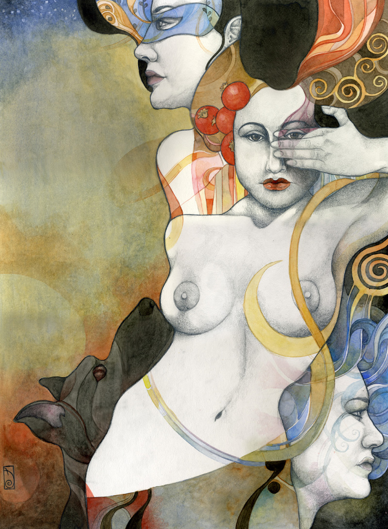 I think of my work as a celebration of the human experience in what they have of sacred and profane. My language is the one of beauty and emotion, composed upon a hybrid of drawing/painting. Graphite drawing of classically constructed bodies, rendered with oil, acrylic washes and abstract embellishment, reflect the point of contact between the physical and the reality of dreams, spirituality, and abstract perceptions. I create my own mythology; characters, stories, fables, worlds that speak and connect with the viewer through the language of symbols and archetypes. Themes like transformation and transitions, the human duality, spiritual and emotional experiences, and the ties of man with nature and the raw forces of life are often explored. Since I focus primarily on the female figure, I can say that my work is also about the the female experience according to my own vision of the feminine: power, creation, energy, witchcraft, life. My women are forces of nature, sorceresses, bearers of darkness and light.”