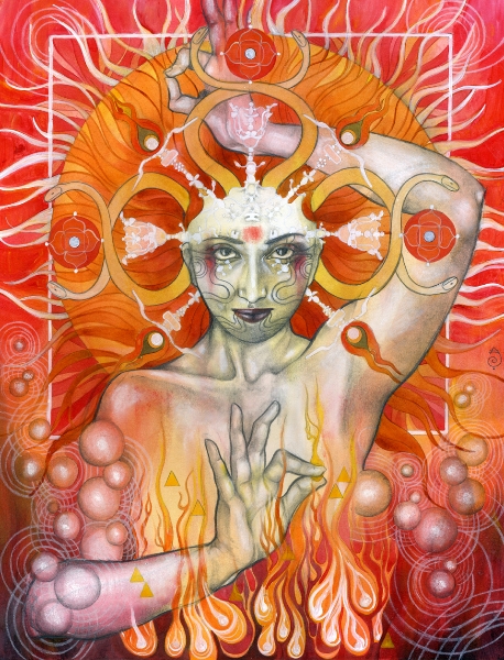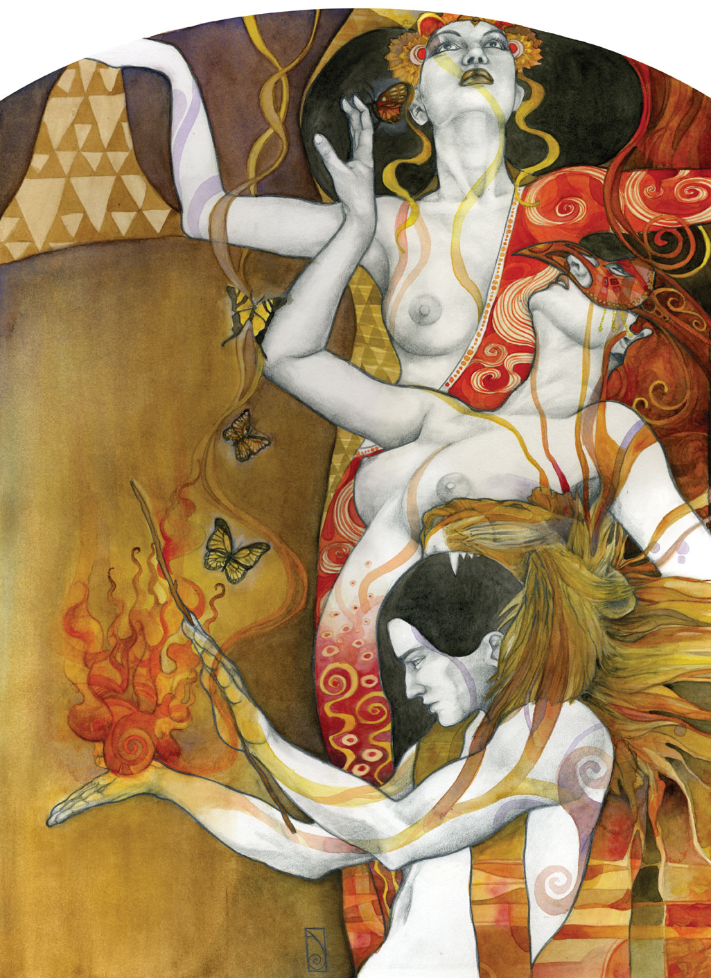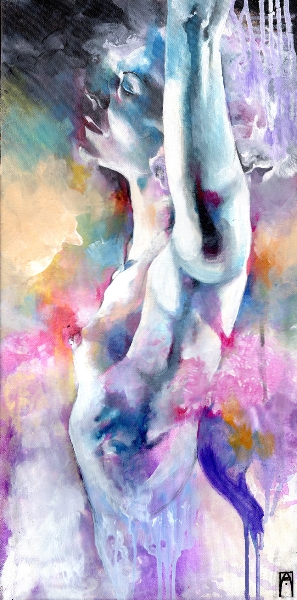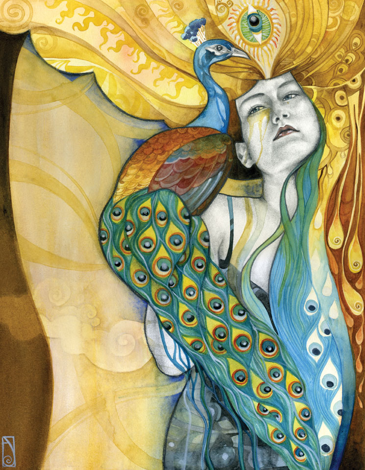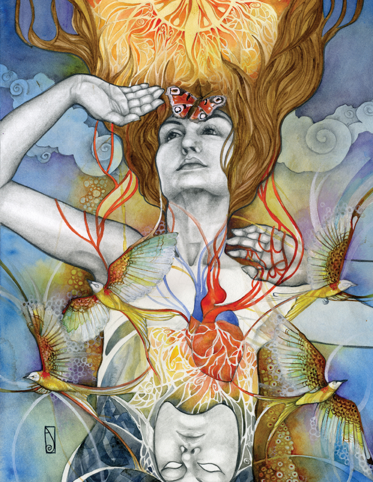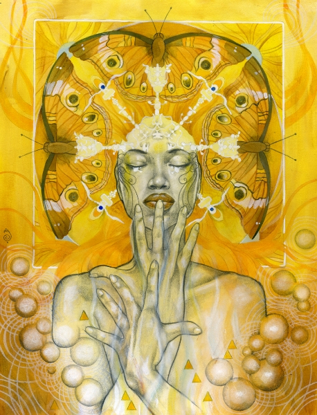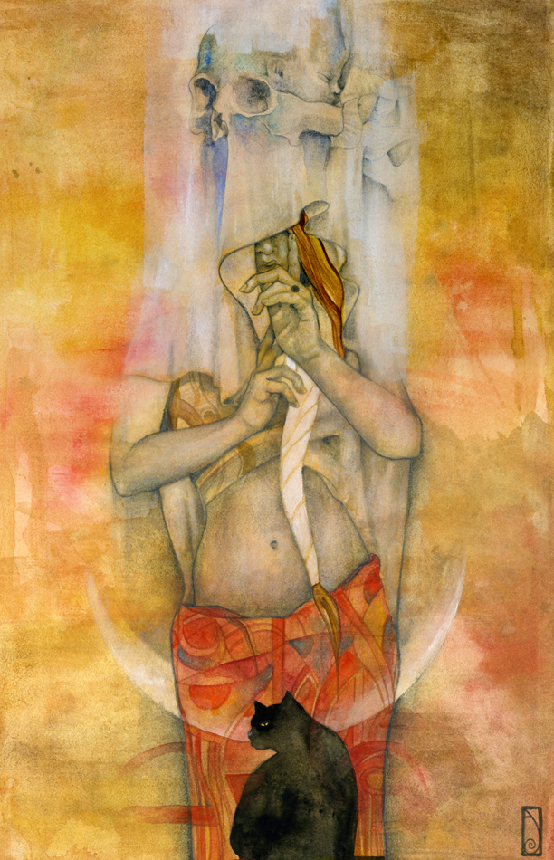 I think of my work as a celebration of the human experience in what they have of sacred and profane. My language is the one of beauty and emotion, composed upon a hybrid of drawing/painting. Graphite drawing of classically constructed bodies, rendered with oil, acrylic washes and abstract embellishment, reflect the point of contact between the physical and the reality of dreams, spirituality, and abstract perceptions. I create my own mythology; characters, stories, fables, worlds that speak and connect with the viewer through the language of symbols and archetypes. Themes like transformation and transitions, the human duality, spiritual and emotional experiences, and the ties of man with nature and the raw forces of life are often explored. Since I focus primarily on the female figure, I can say that my work is also about the the female experience according to my own vision of the feminine: power, creation, energy, witchcraft, life. My women are forces of nature, sorceresses, bearers of darkness and light.”